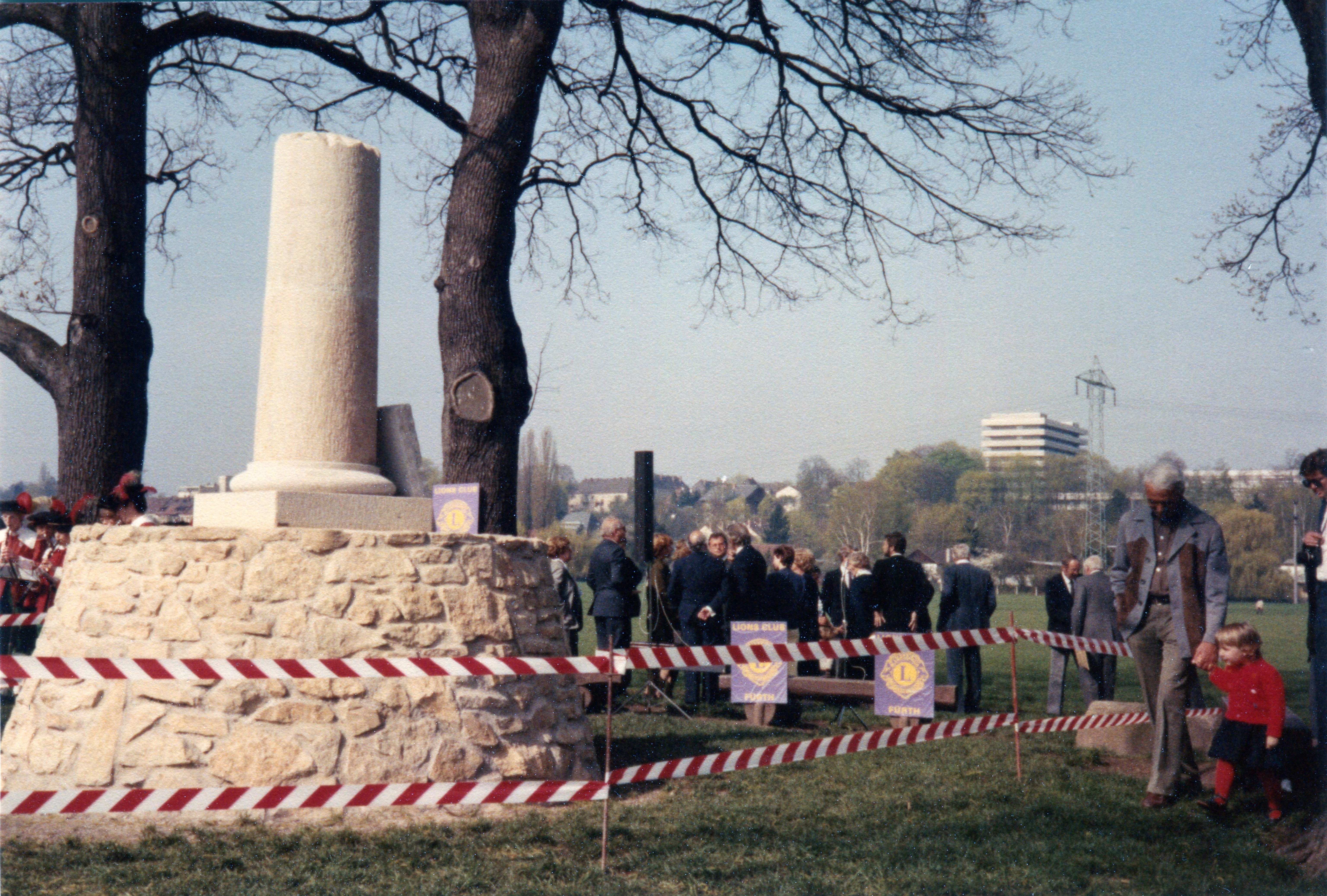 | Beschreibung | Eröffnung des neuen Gedenksteins und Denkmals der Martinskapelle durch den Lions Club Fürth im April 1983. Im Hintergrund Hochhaus das ehem. Kinderklinik. | ||