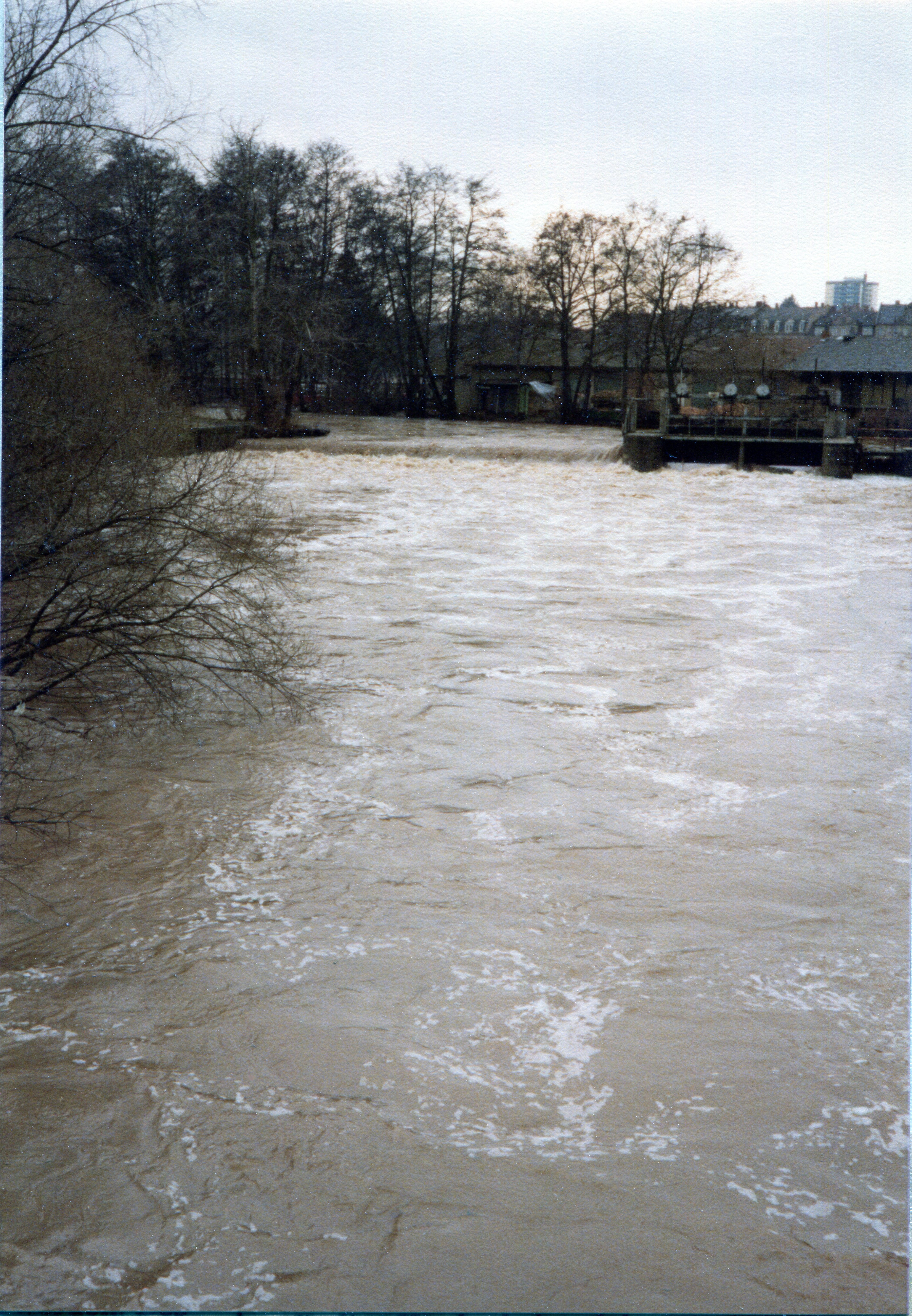 | Beschreibung | Hochwasser der Rednitz mit Blick auf das Stauwehr der abgerissenen Foerstermühle im Februar 1981 | ||