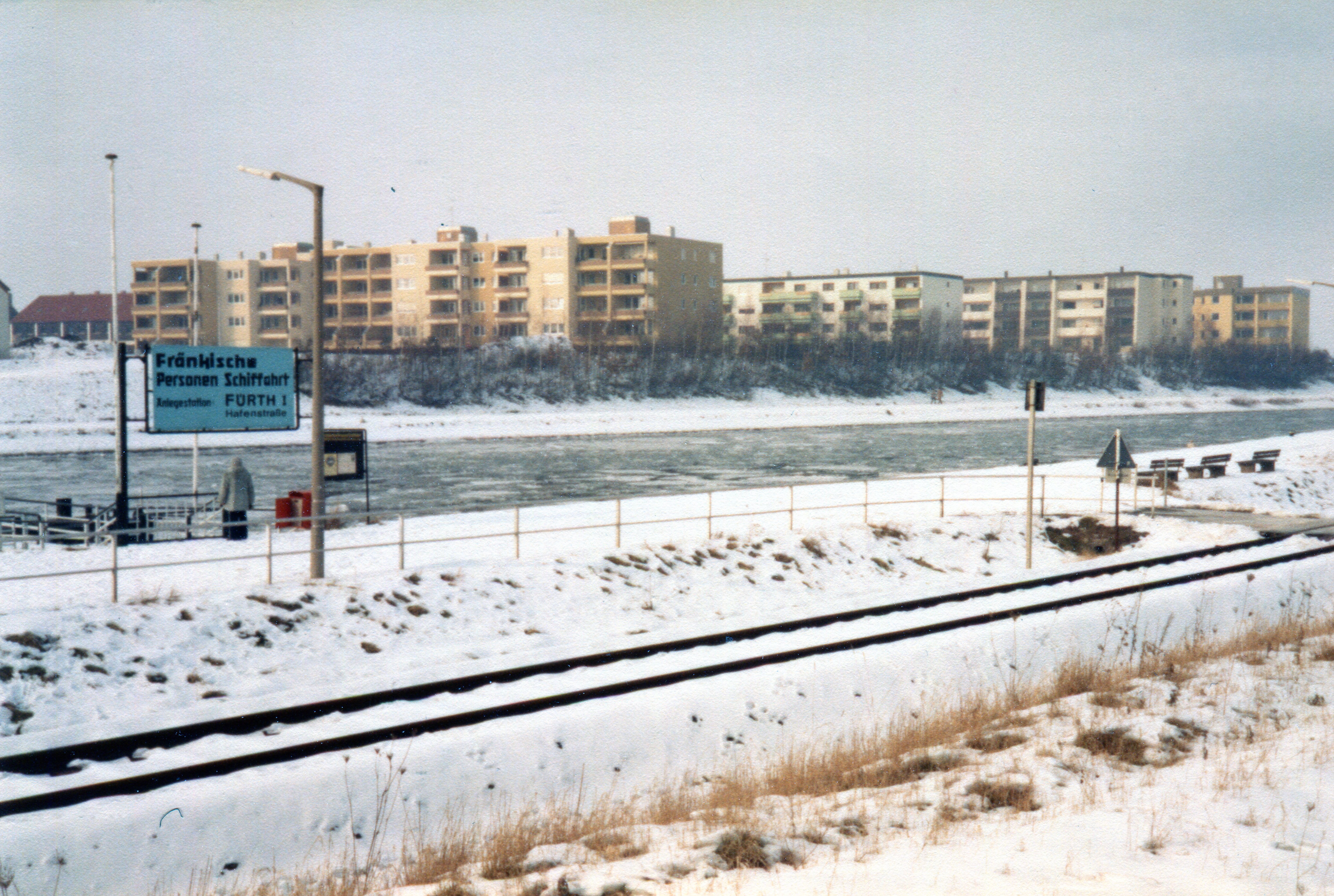 | Beschreibung | vereister Main-Donau-Kanal an der ehemaligen Anlegestation Fürth I an der Hafenstraße mit Gleisbett der Hafenbahn, im Hintergrund Bebauung in Burgfarrnbach am Farrnbachweg, Veilchenweg und Jasminweg im Januar 1983 | ||