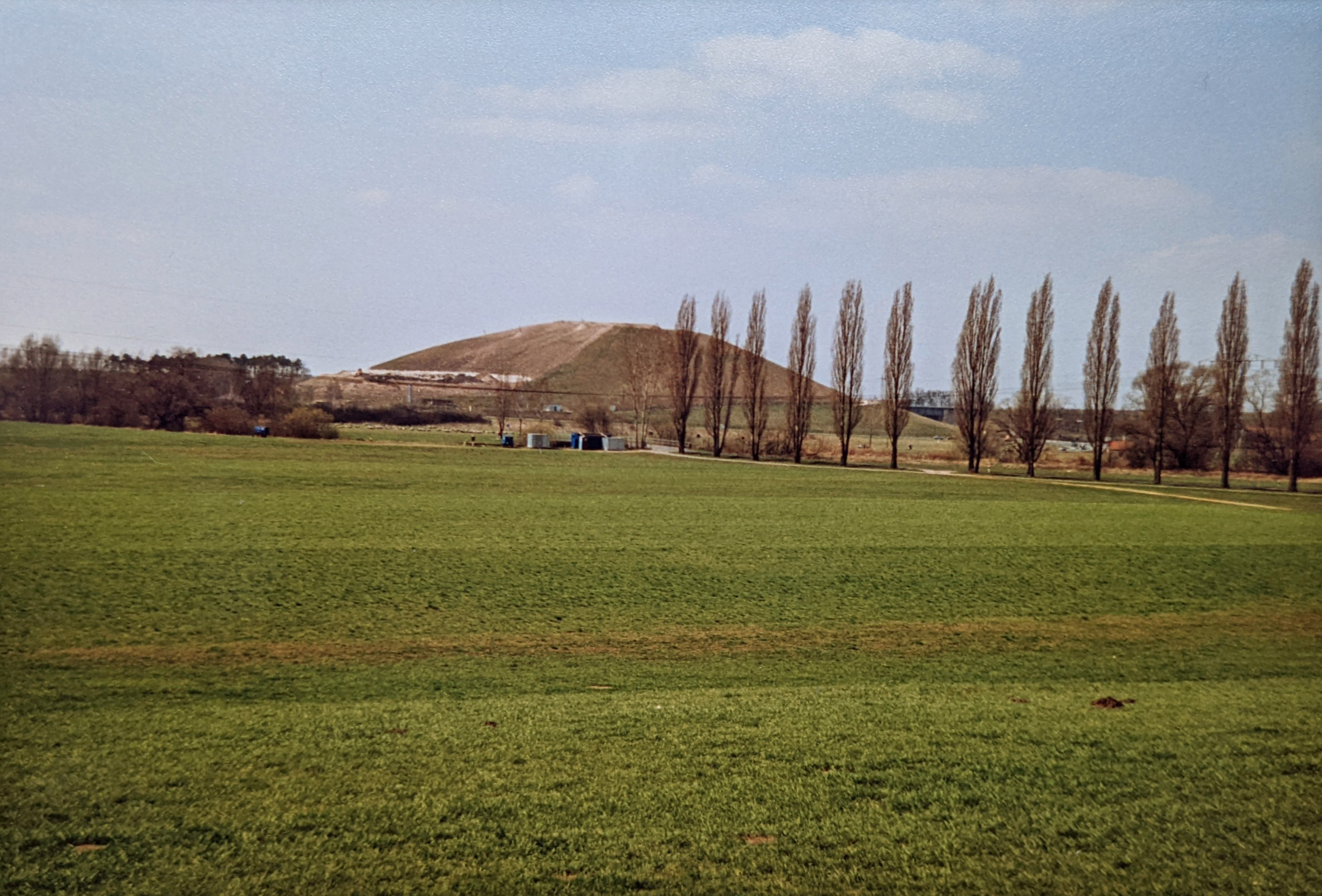 | Beschreibung | Blick von Stadeln auf den Atzenhofer Müllberg, später Solarberg, April 1993. Die Pappelallee wurde 1960 gepflanzt. | ||