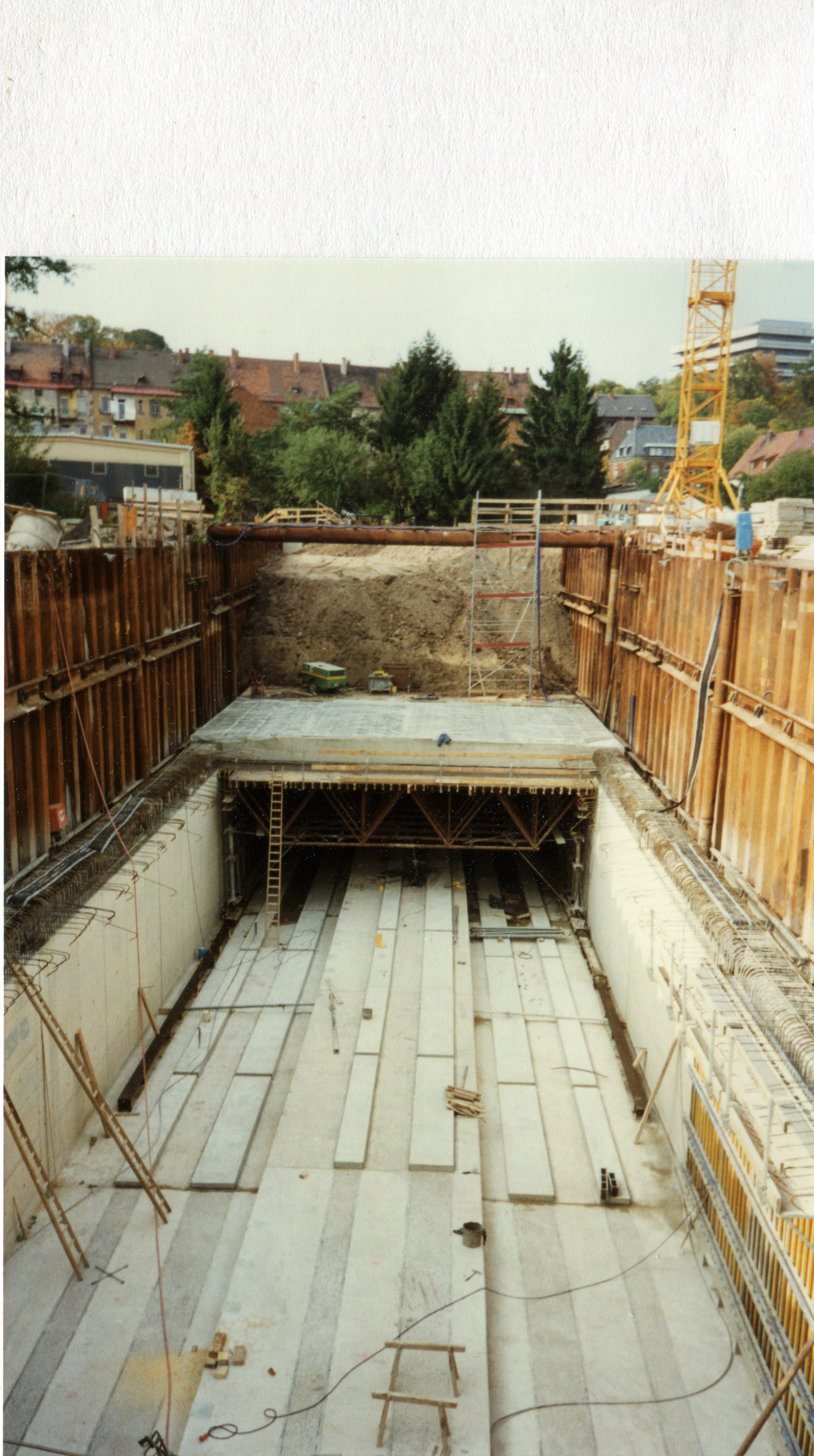 | Beschreibung | Tiefbauarbeiten für den U-Bahnhof Stadthalle Blickrichtung Vacher Straße im Oktober 1996 | ||