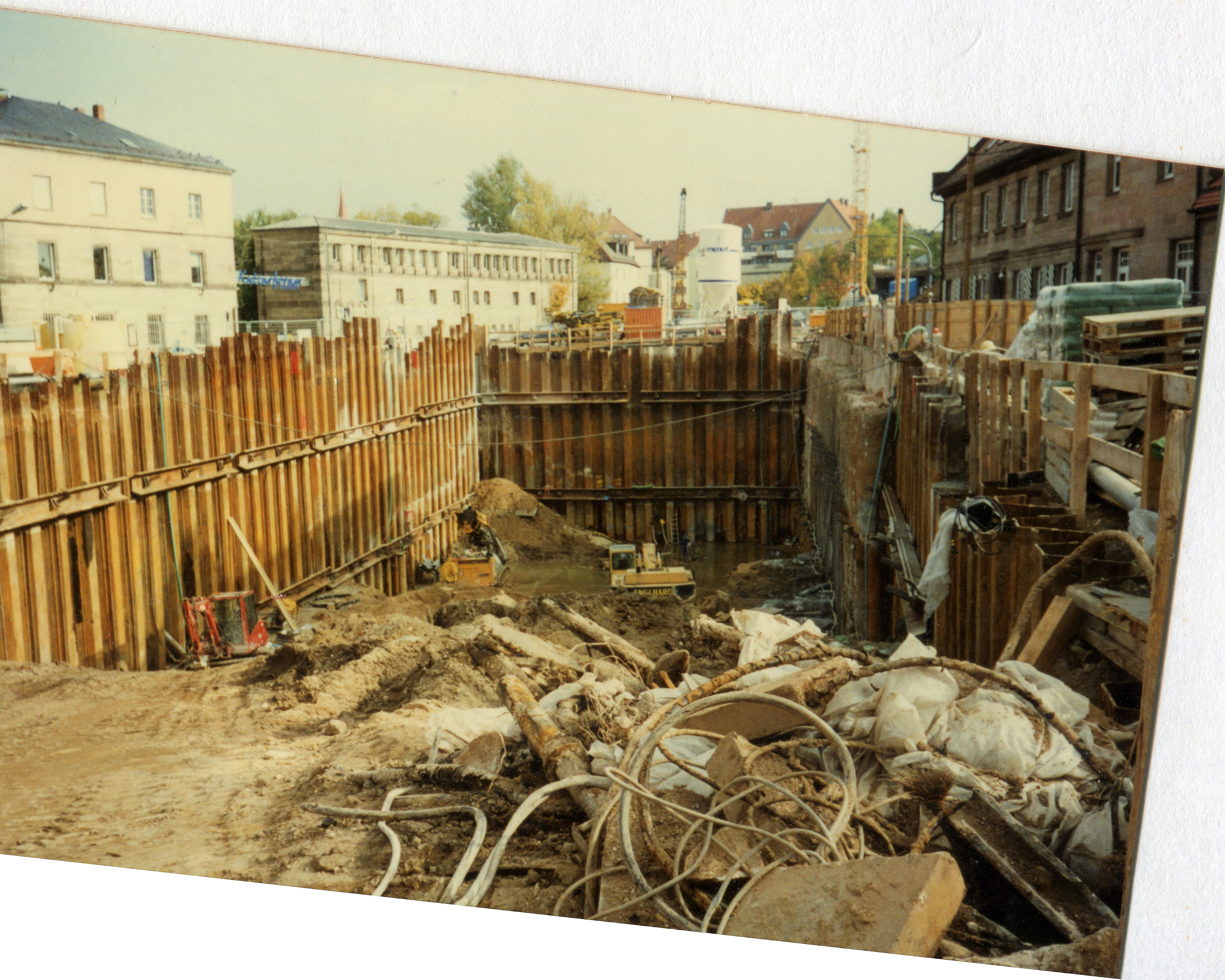 | Beschreibung | Tiefbauarbeiten für den U-Bahnhof Stadthalle Blickrichtung Kulturforum im Oktober 1996 | ||