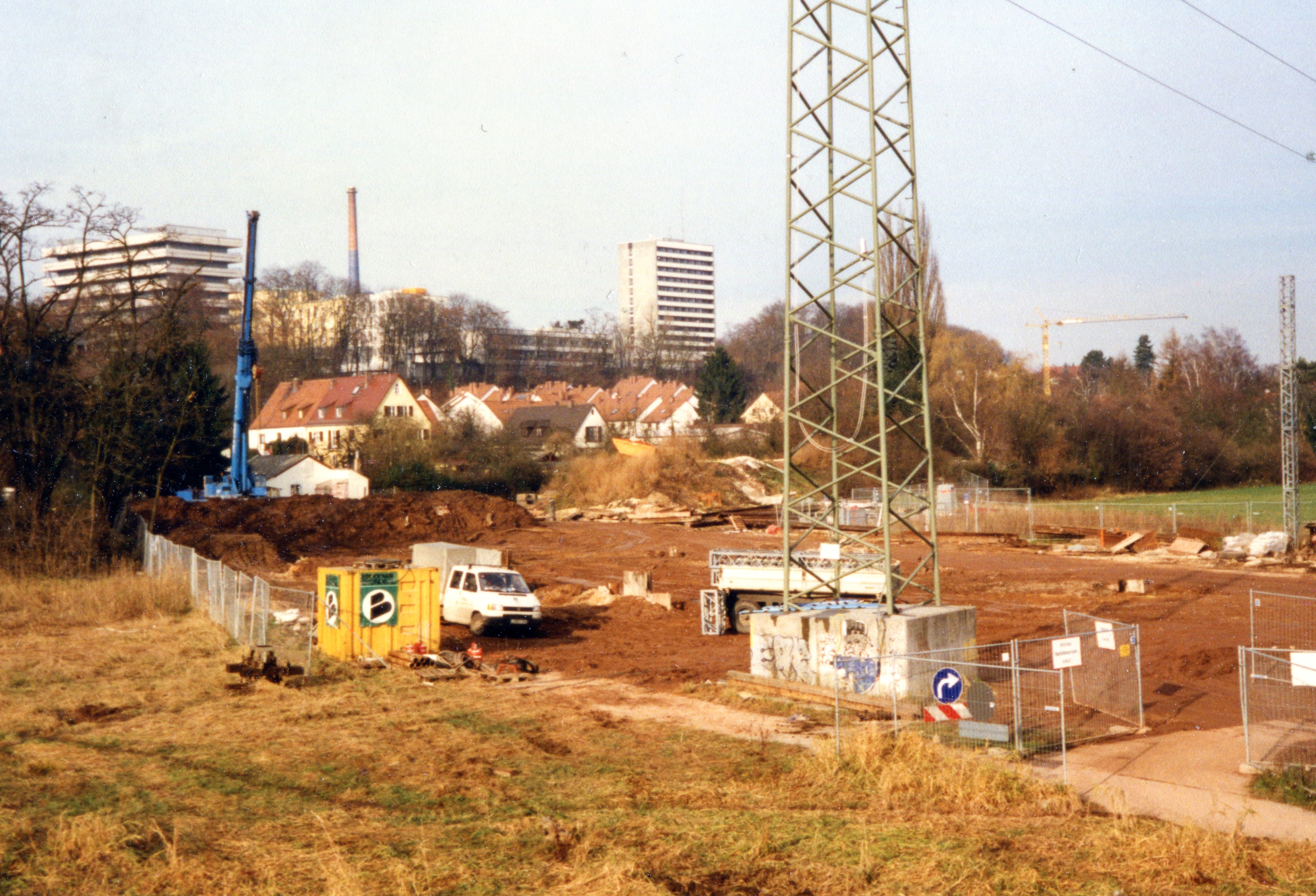| Beschreibung | Bauarbeiten U-Bahnhof Stadthalle Blickrichtung Vacher Straße, im Hintergrund Gebäude vom Klinikum Fürth im Dezember 1996 | ||