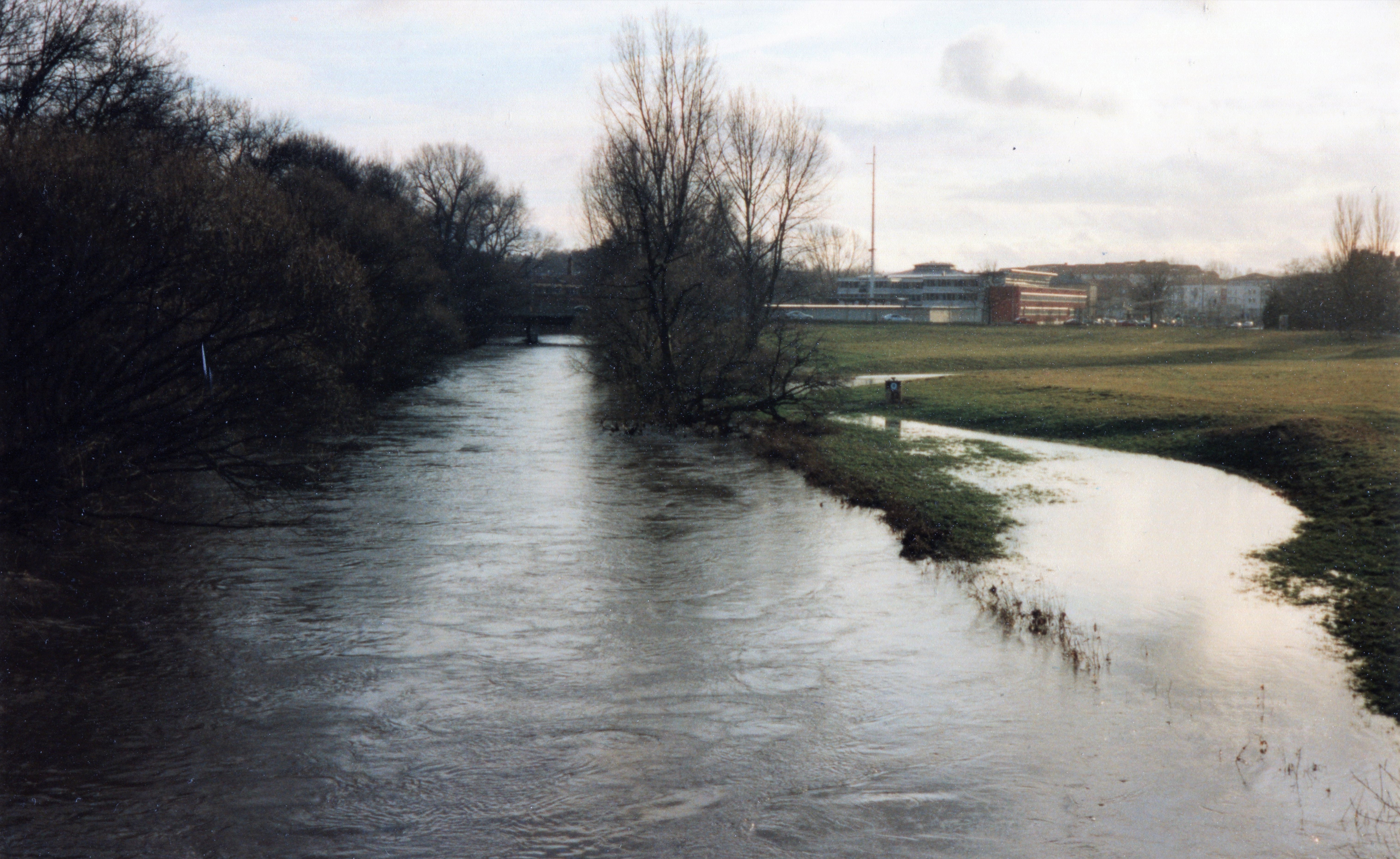| Beschreibung | Blick vom Käppnersteg auf die Rednitz mit Einmündung vom Scherbsgraben, Februar 1999 – im Hintergrund die Polizeihauptwache Kapellenstraße | ||