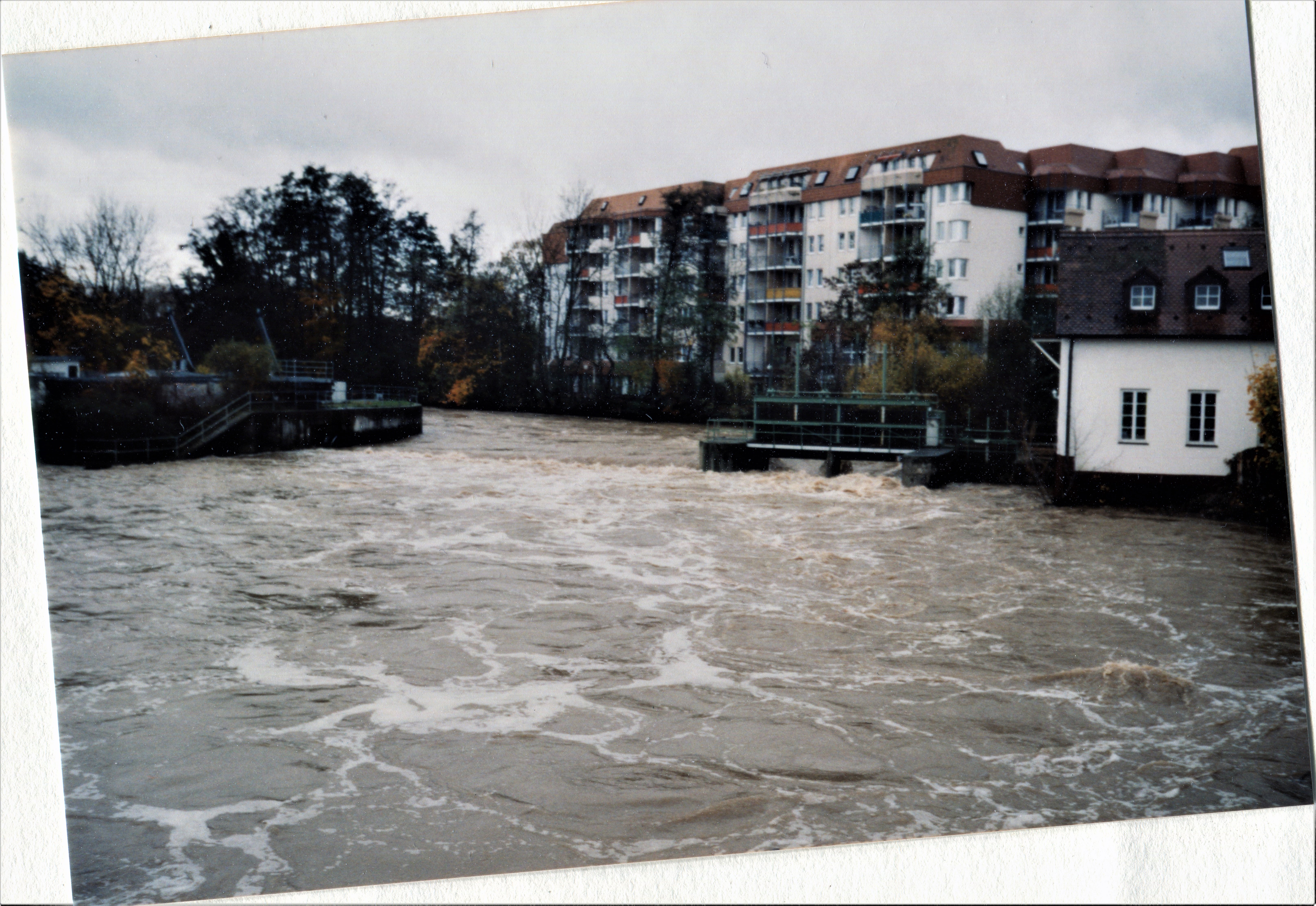 | Beschreibung | Hochwasser an der Stau- und Triebwerksanlage der Foerstermühle - im Hintergrund die Senioreneinrichtung Kursana im Februar 1999 | ||