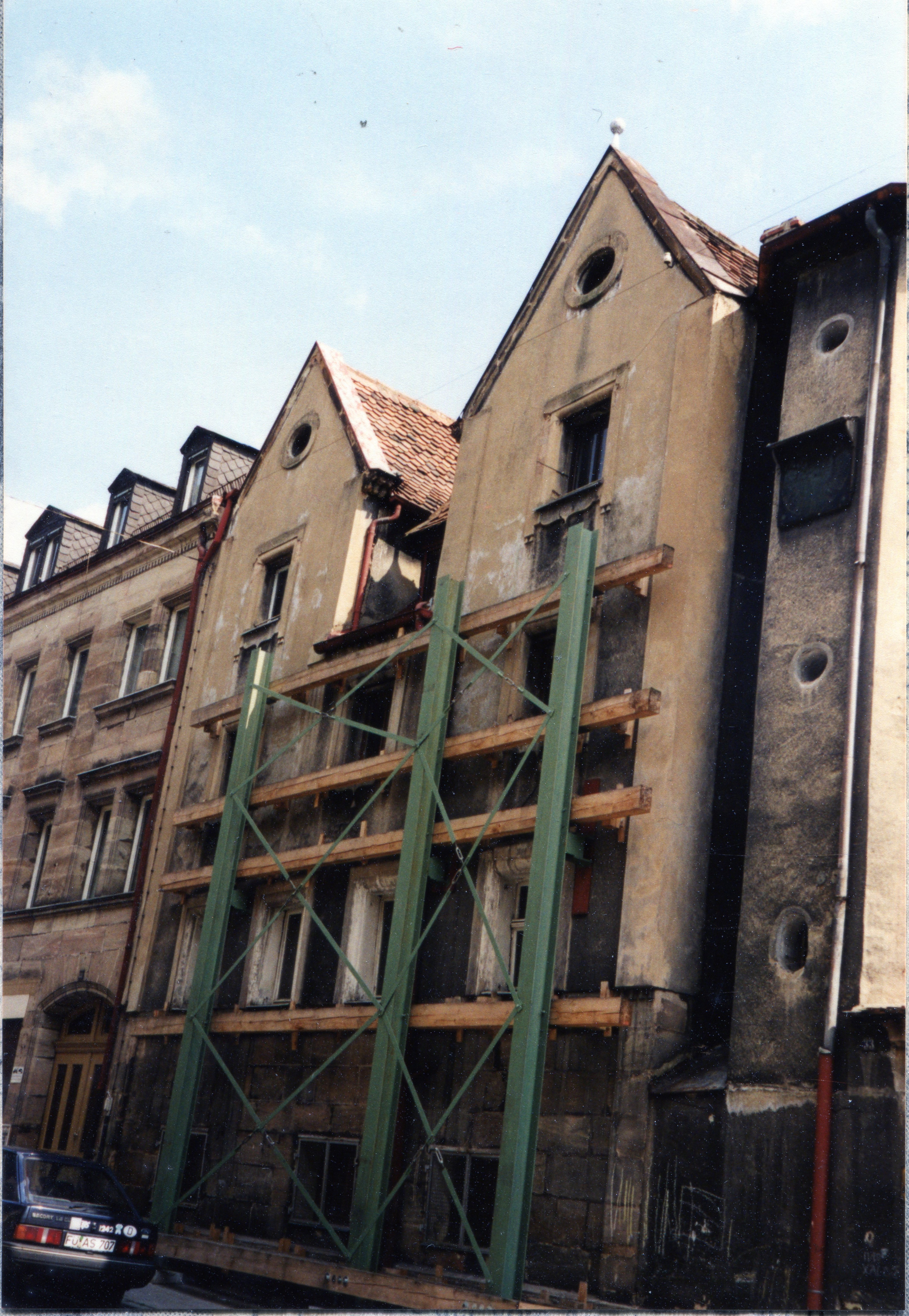 | Beschreibung | Das mit Stahlträgern gesicherte Lochner'sche Gartenhaus, August 1999 | ||