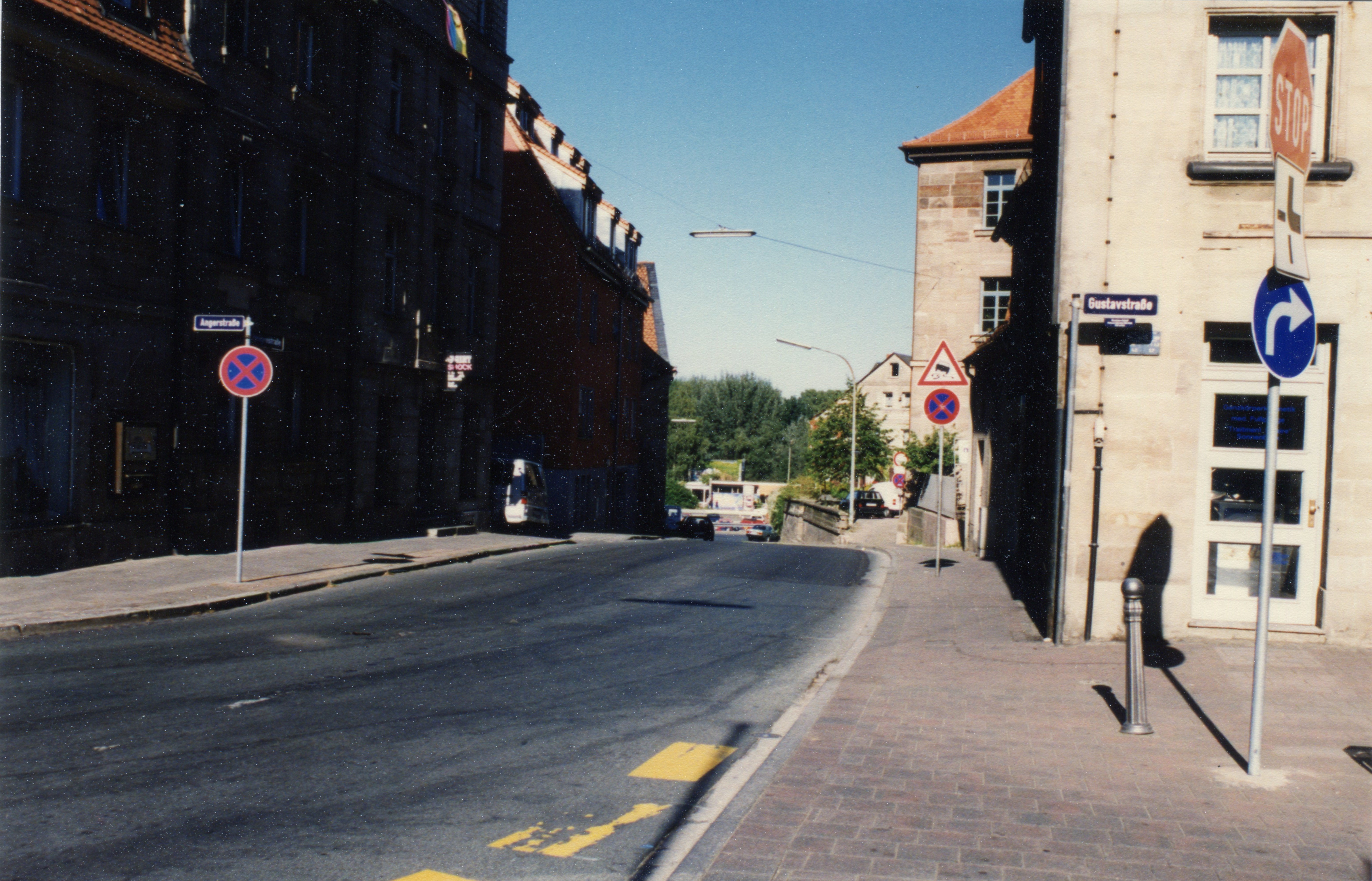 | Beschreibung | Blick in den Heiligenberg und Heiligenstraße von der Gustavstraße aus. Rechts Gebäudeecke Gustavstraße 58, dahinter Schulgebäude Kirchenplatz 2, 2a. Links Heiligenstraße 5, Nr. 9 und weitere. Der Blick in den Wiesengrund ist noch frei und unverbaut, im September 1997 | ||