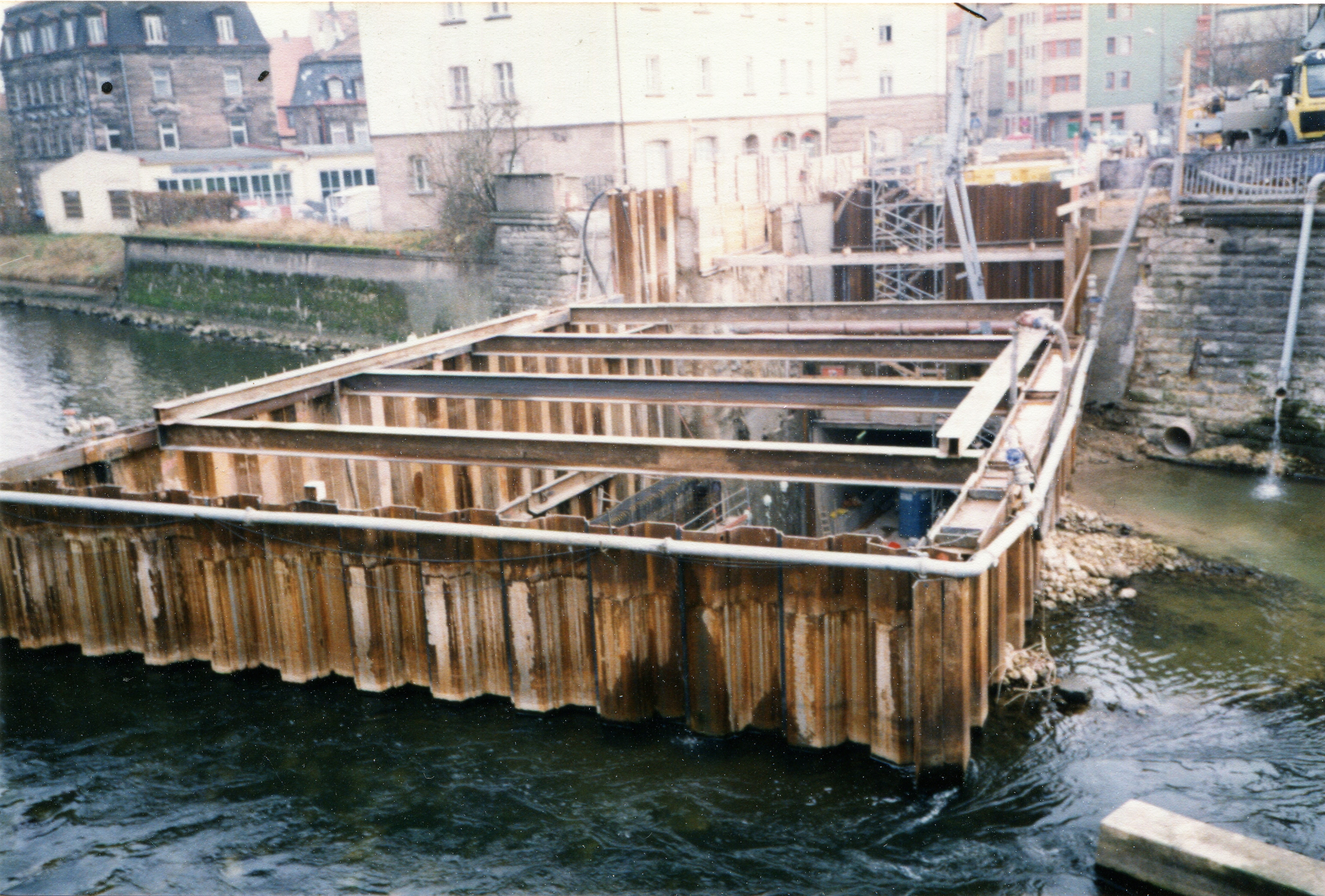 | Beschreibung | Spundwand Kasten in der Rednitz an der Maxbrücke. Vorbereitung zu den Tiefbauarbeiten zur Unterquerung des Flusses für die U-Bahn am 14. Dezember 1997. | ||