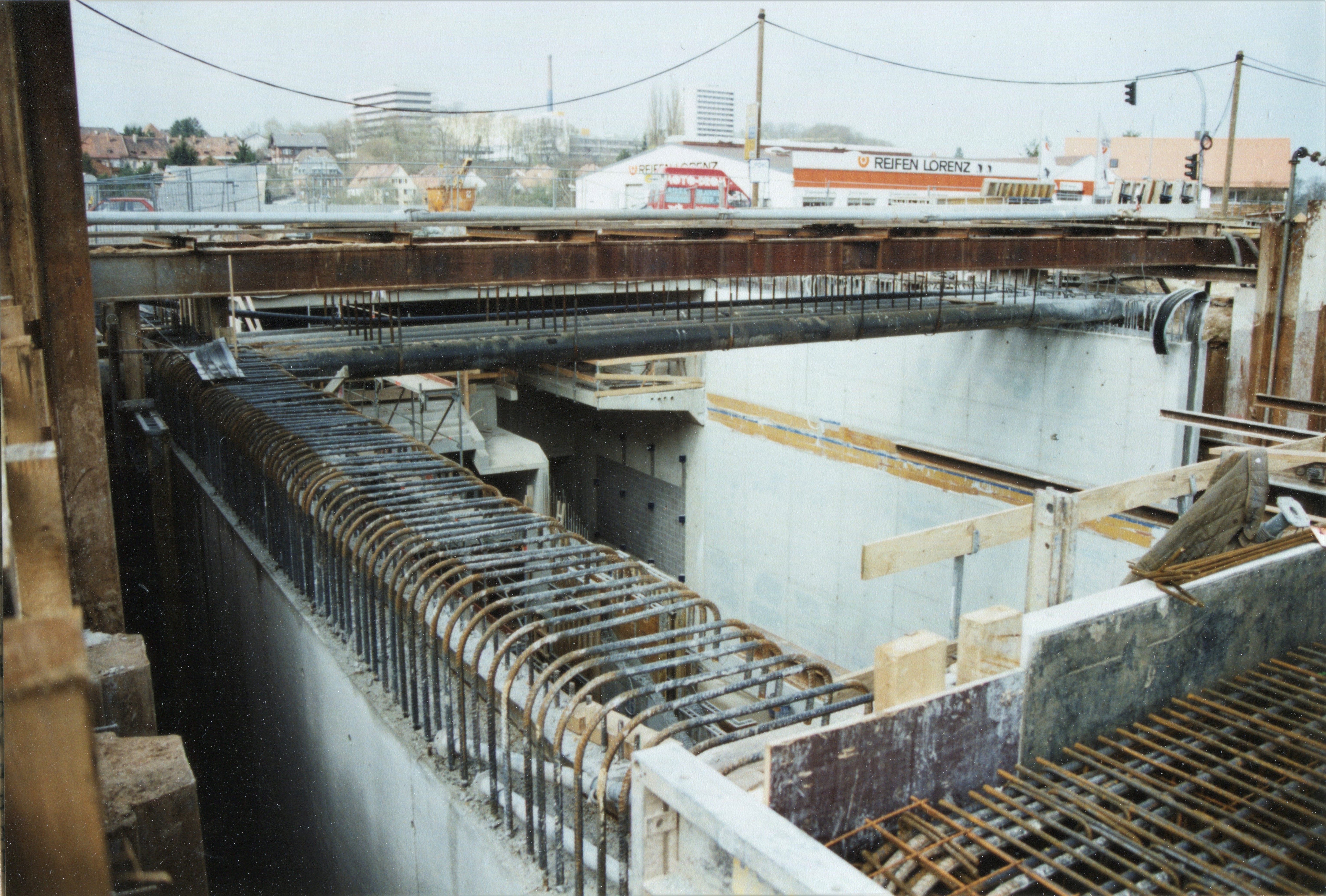 | Beschreibung | Betonierarbeiten am U-Bahnhof Stadthalle Blickrichtung Billinganlage im März 1997. | ||
