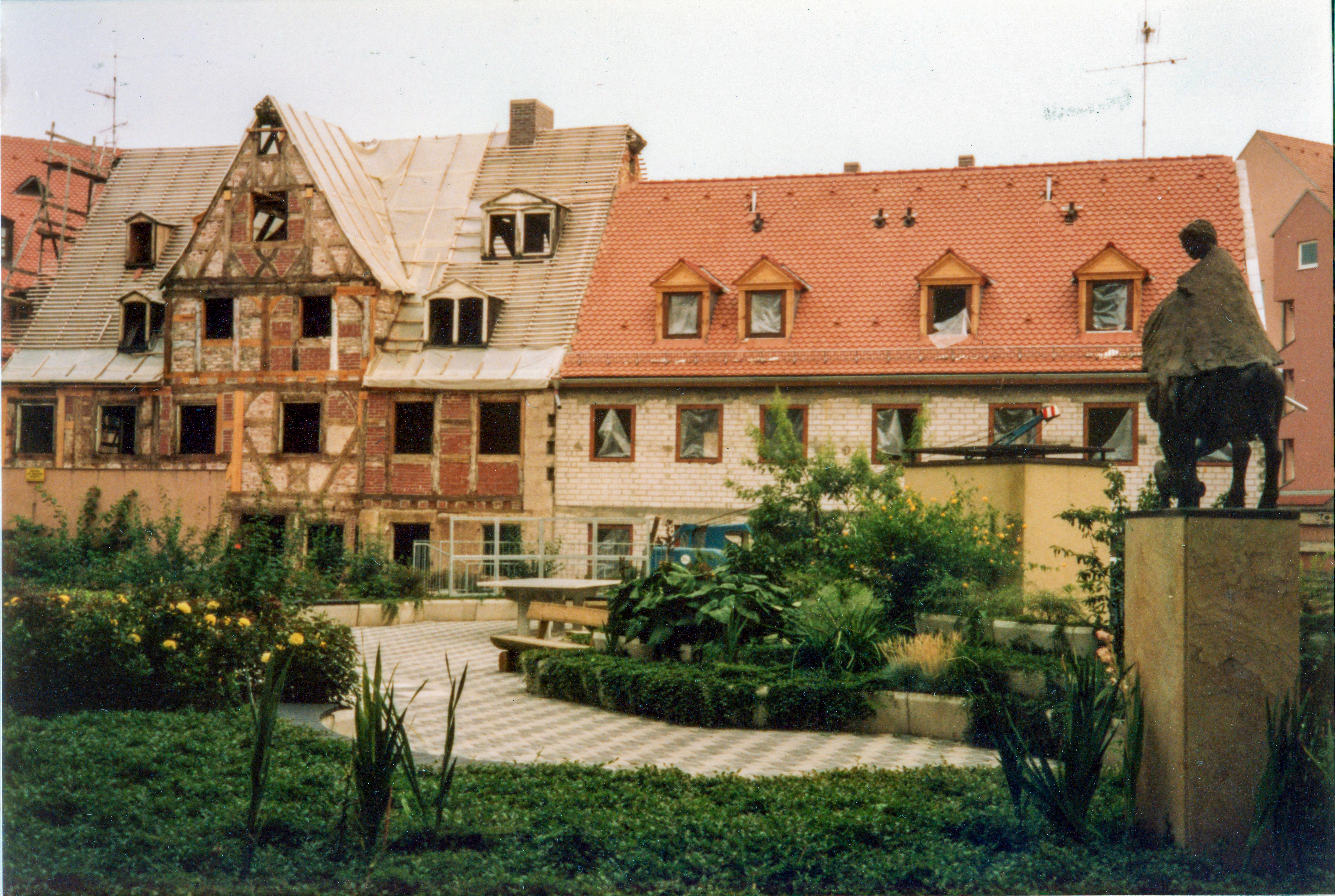 | Beschreibung | Sanierungsarbeiten am Fraveliershof - im Vordergrund Martin von Tours Plastik von Gudrun Kunstmann, 1982 | ||