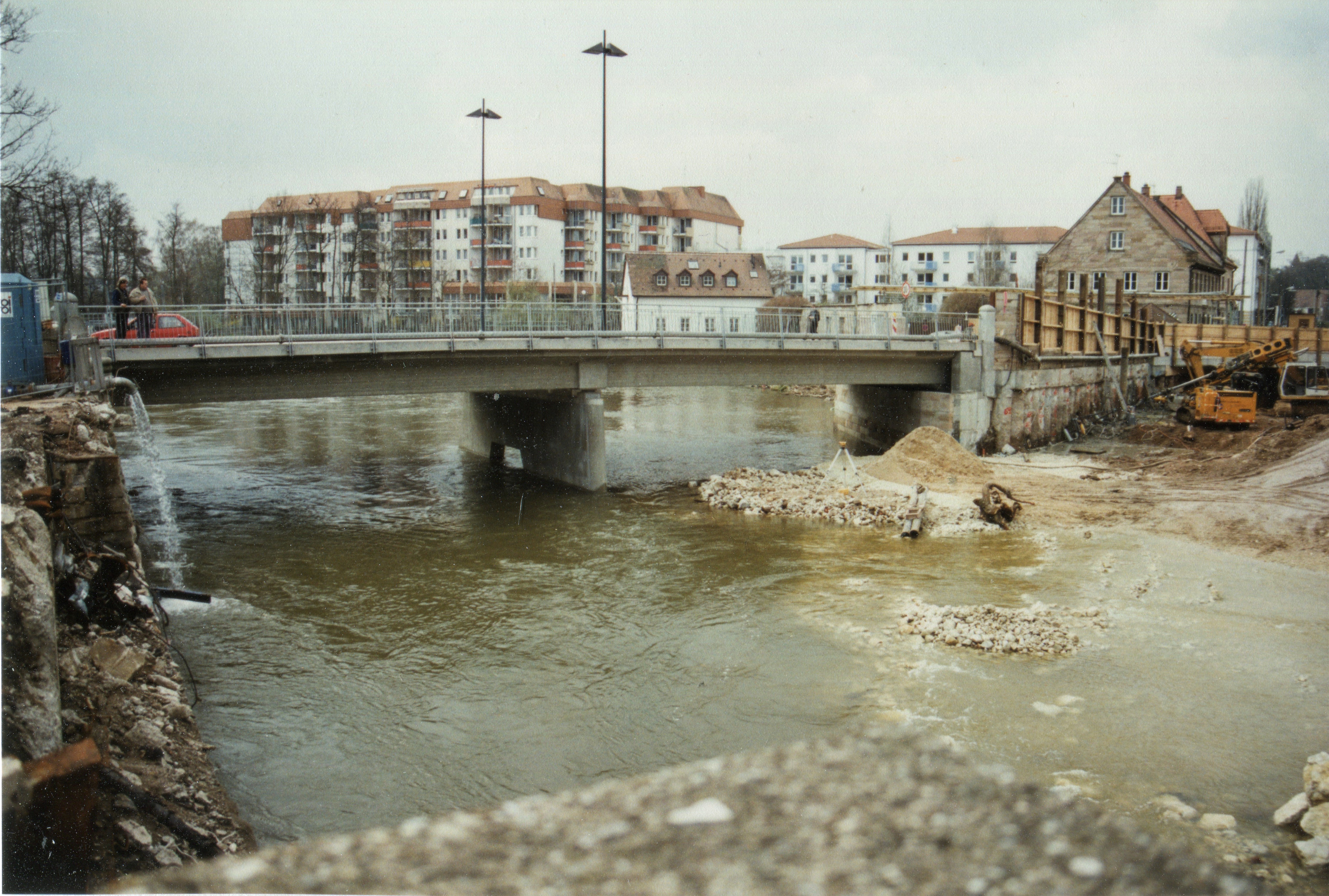 | Beschreibung | Spundwand Kasten in der Rednitz an der Maxbrücke mit prov. Uferbefestigung mittels Steinen zur Vorbereitung zu den Tiefbauarbeiten zur Unterquerung des Flusses für die U-Bahn im März 1997. | ||