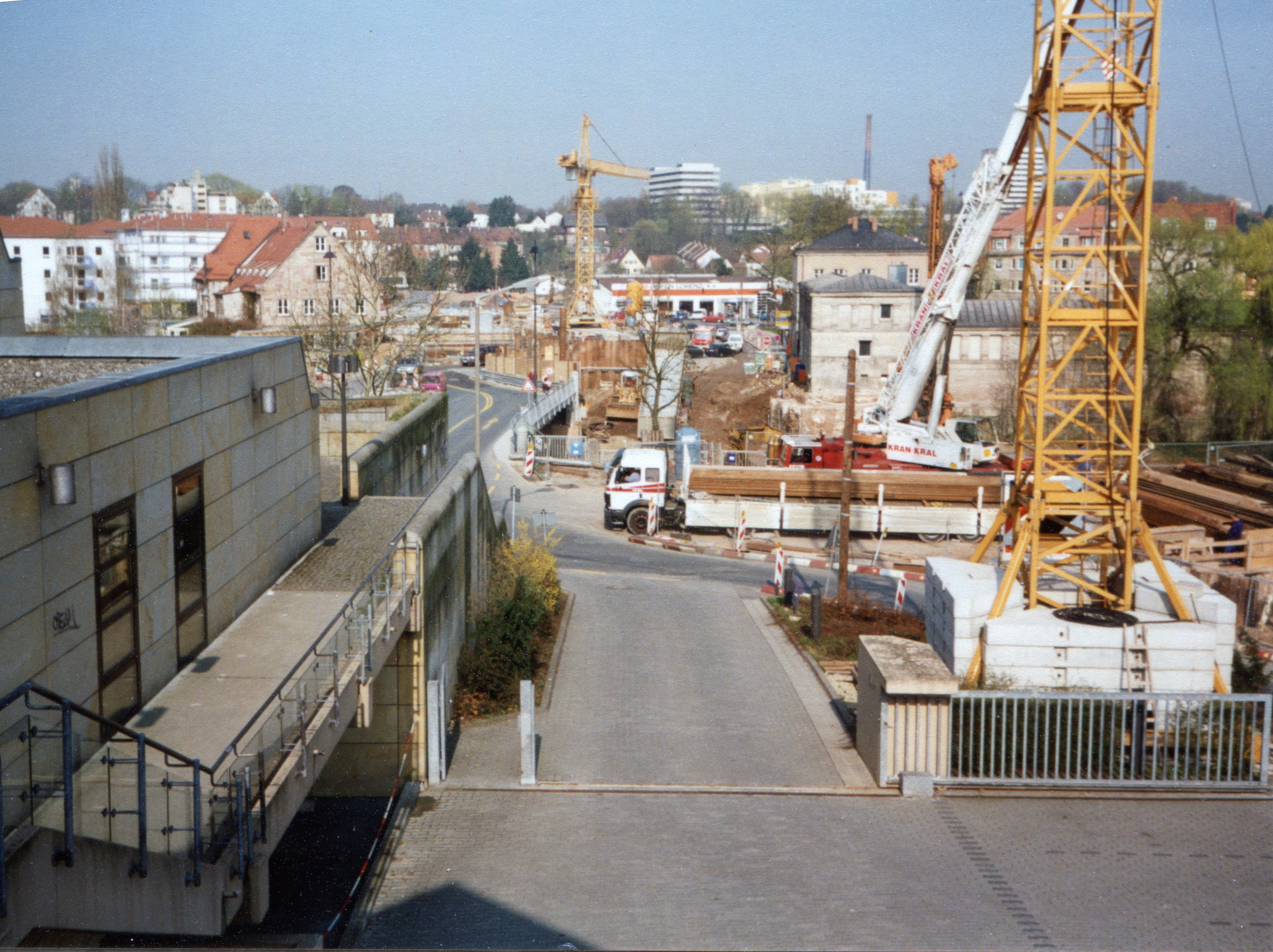 | Beschreibung | Blick von der Stadthalle auf die U-Bahn Baustelle mit Rednitzunterquerung und des zukünftigen U-Bahnhof Stadthalle im April 1997 | ||