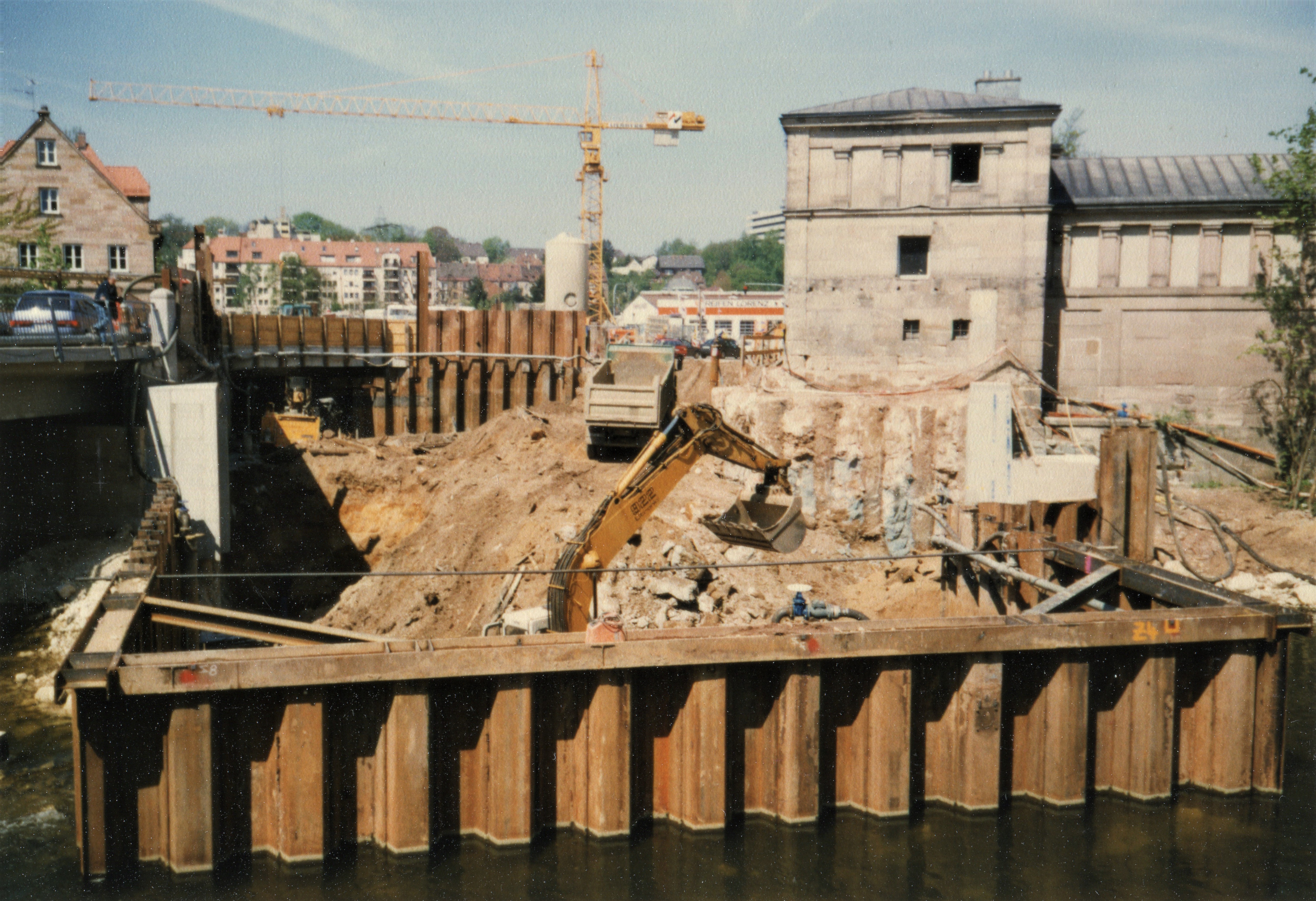 | Beschreibung | Spundwand Kasten in der Rednitz vor dem Kulturforum zur Vorbereitung zu den Tiefbauarbeiten zur Unterquerung des Flusses für die U-Bahn im Mai 1997 | ||