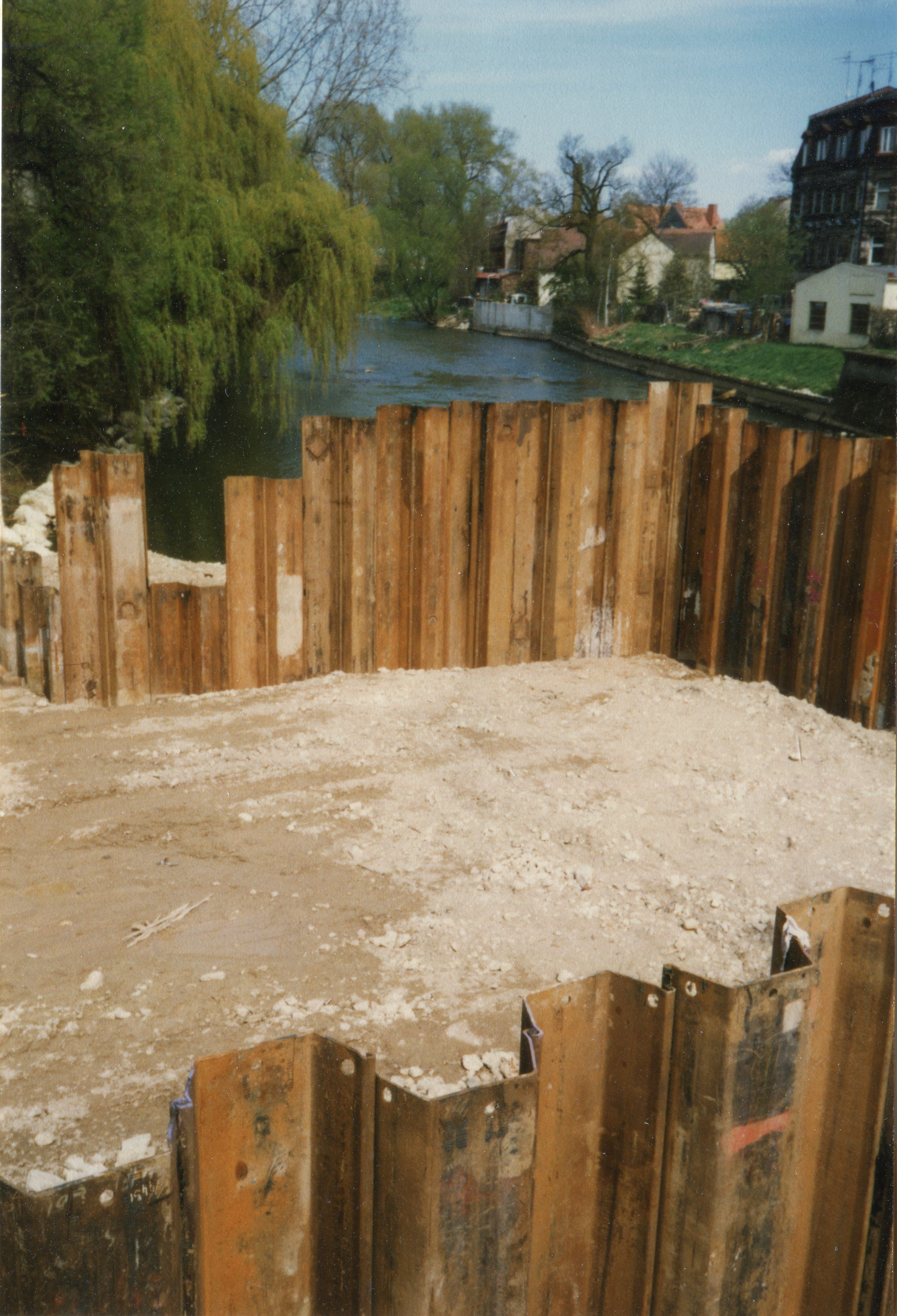 | Beschreibung | Spundwand Kasten in der Rednitz vor dem Kulturforum zur Vorbereitung zu den Tiefbauarbeiten zur Unterquerung des Flusses für die U-Bahn im April 1997 | ||