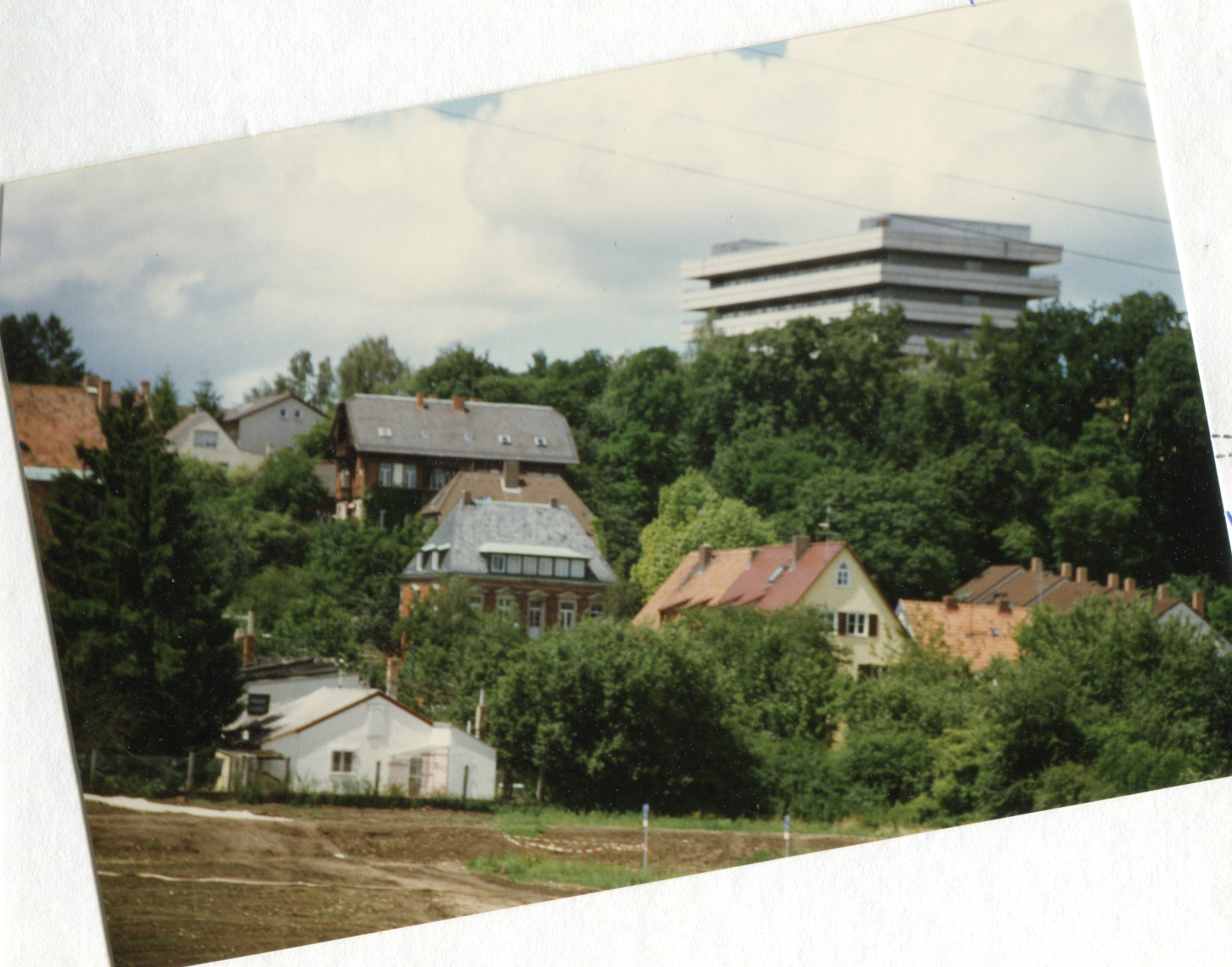| Beschreibung | Blick vom Wiesengrund über die Vacher Straße. Im Hintergrund Gebäude der abgerissenen Kinderklinik im Juni 1997 | ||