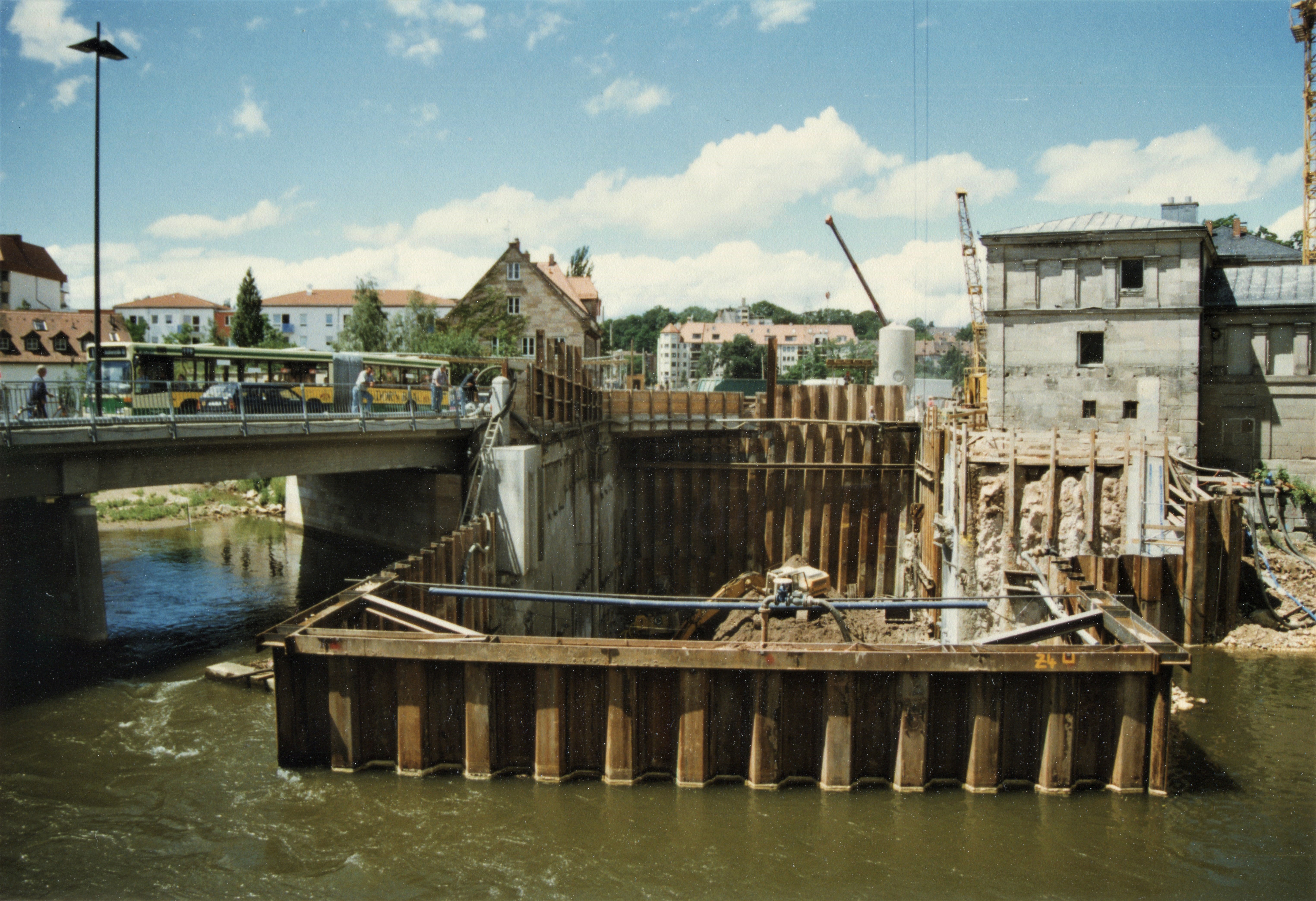 | Beschreibung | Spundwand Kasten in der Rednitz vor dem Kulturforum zur Vorbereitung zu den Tiefbauarbeiten zur Unterquerung des Flusses für die U-Bahn im Juni 1997 | ||