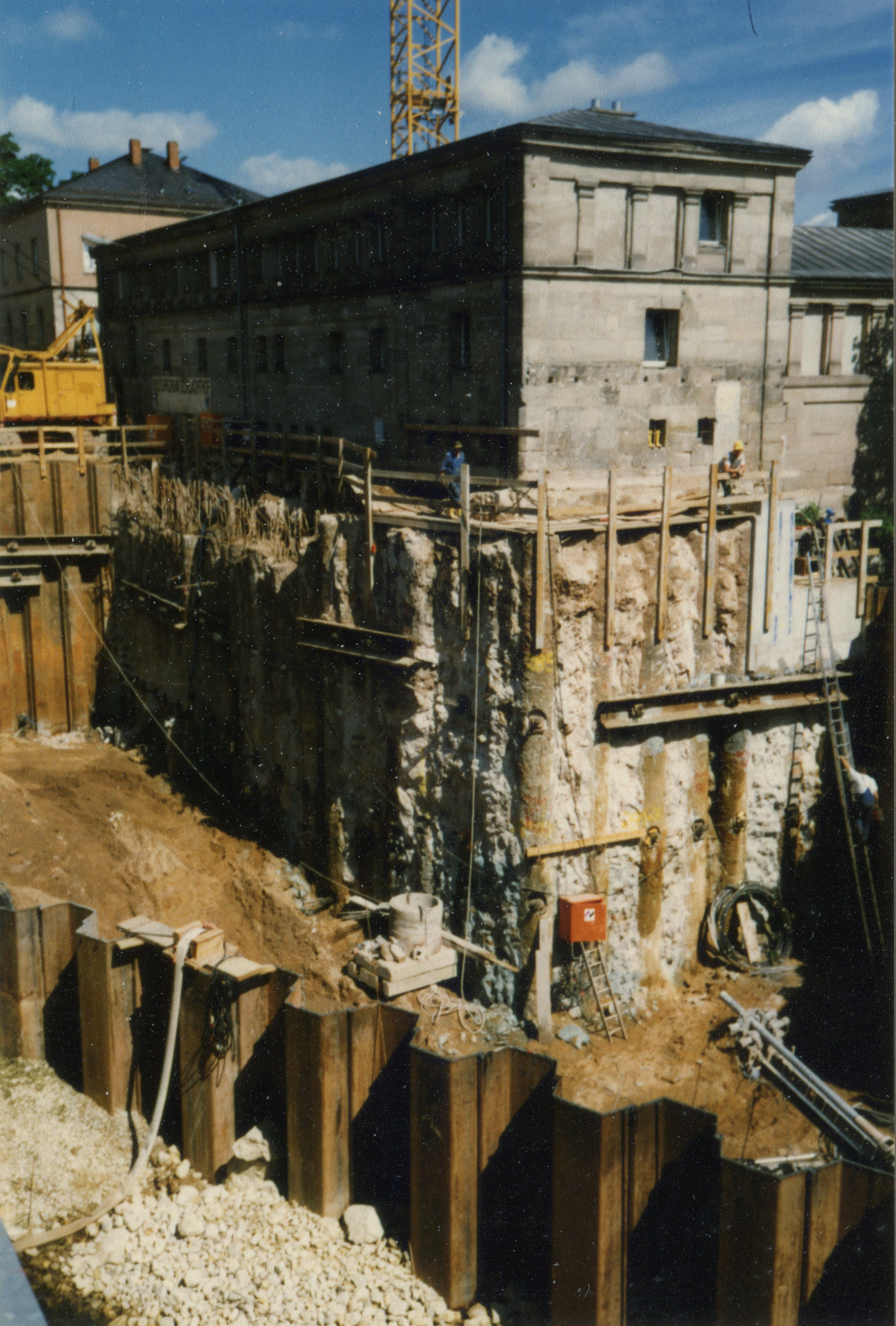 | Beschreibung | Spundwand Kasten in der Rednitz vor dem Kulturforum zur Vorbereitung zu den Tiefbauarbeiten zur Unterquerung des Flusses für die U-Bahn im Juni 1997 | ||
