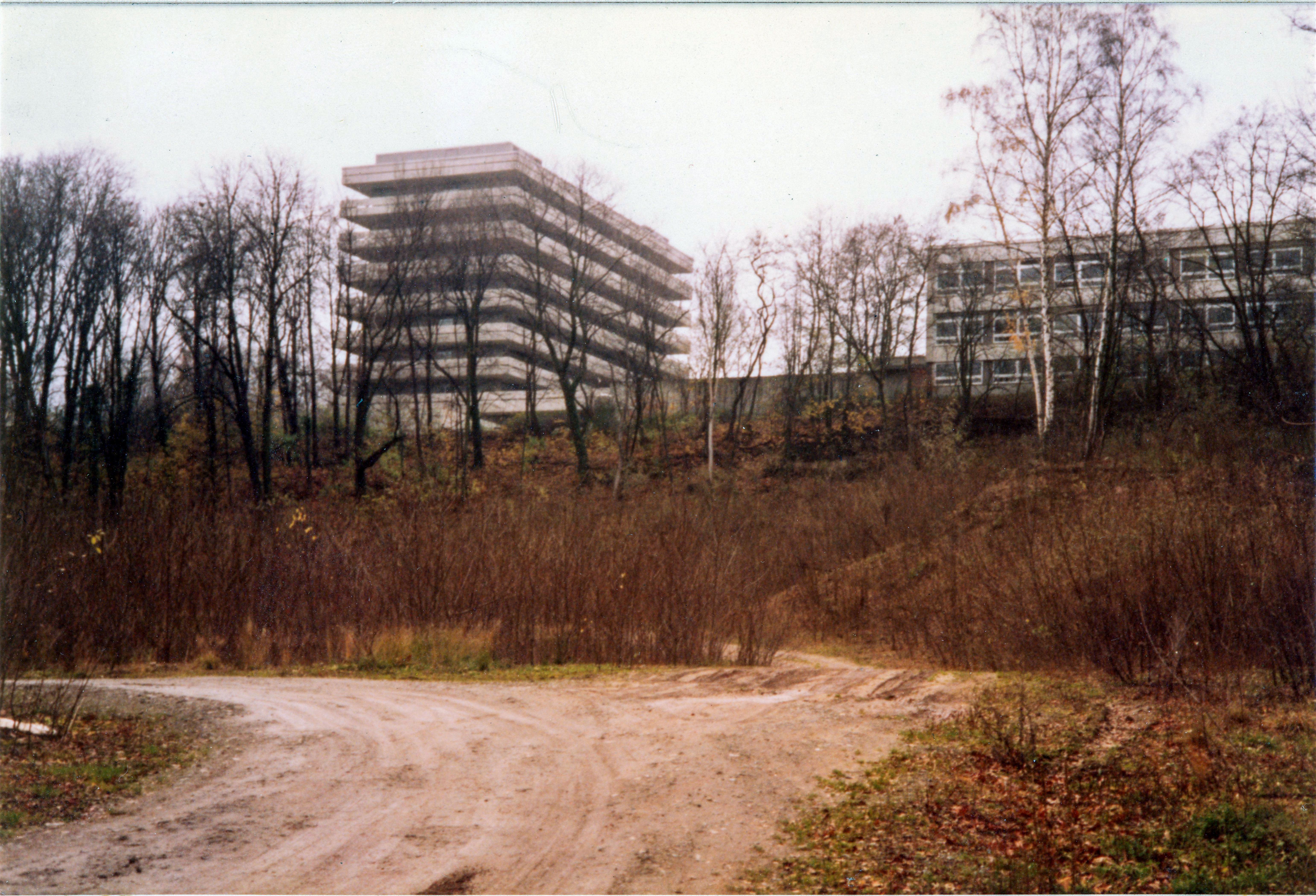 | Beschreibung | Blick über den Grüner Park an der Vacher Straße zur ehem. Kinderklinik, Nov. 1981 | ||