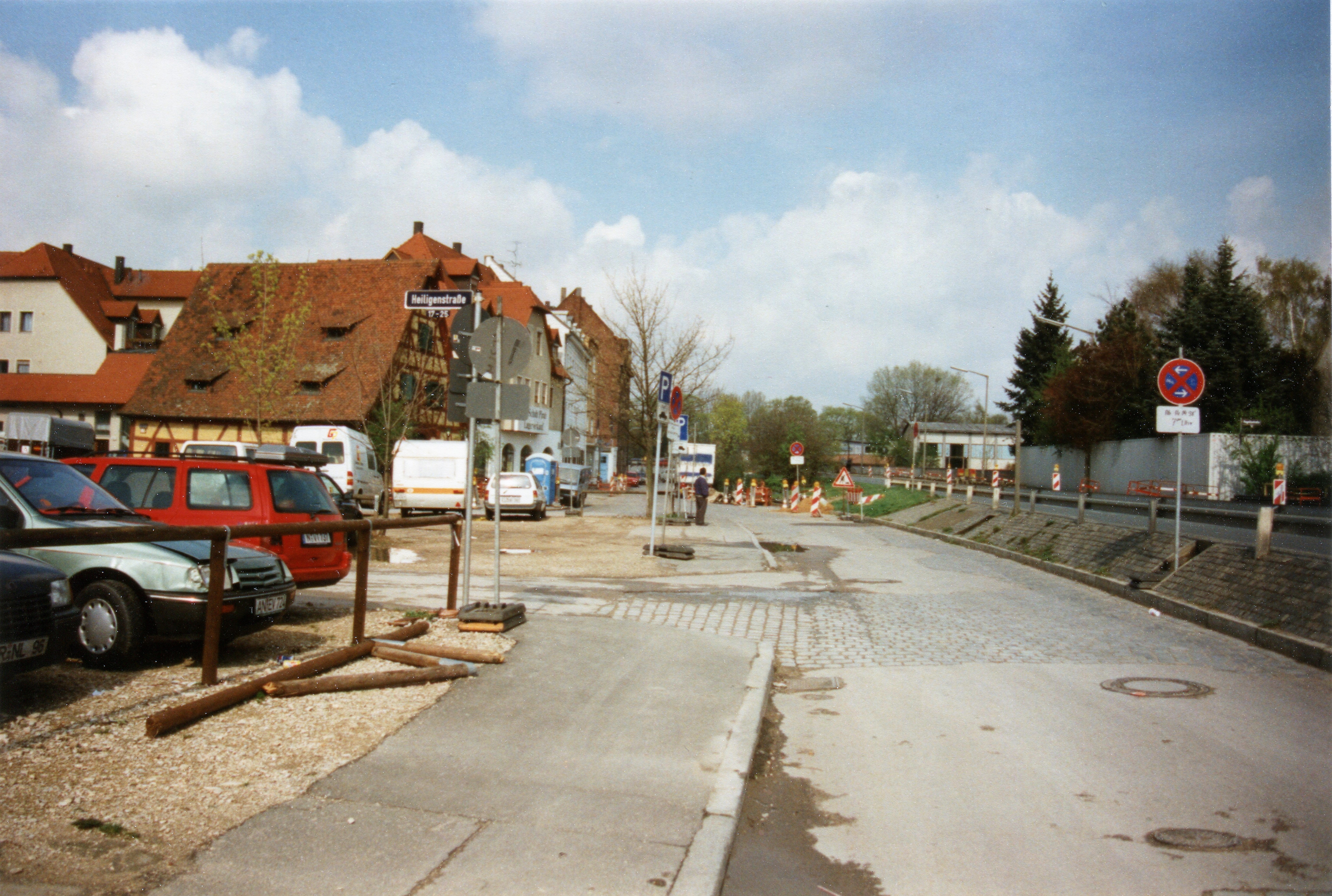 | Beschreibung | Baubeginn der Lärmschutzreihenhäuser Heiligenstraße 33-59 als 1. BA an dieser Stelle und späterer 2. BA über die Einmündung Heiligenstraße hinweg zur Pegnitzstraße der "Kleeblatt Wohnbau". Die Kapellenstraße noch 2-spurig, (rechts Jugendhaus Lindenhain), später 4-spurig ausgebaute Nordspange im März 1998 | ||