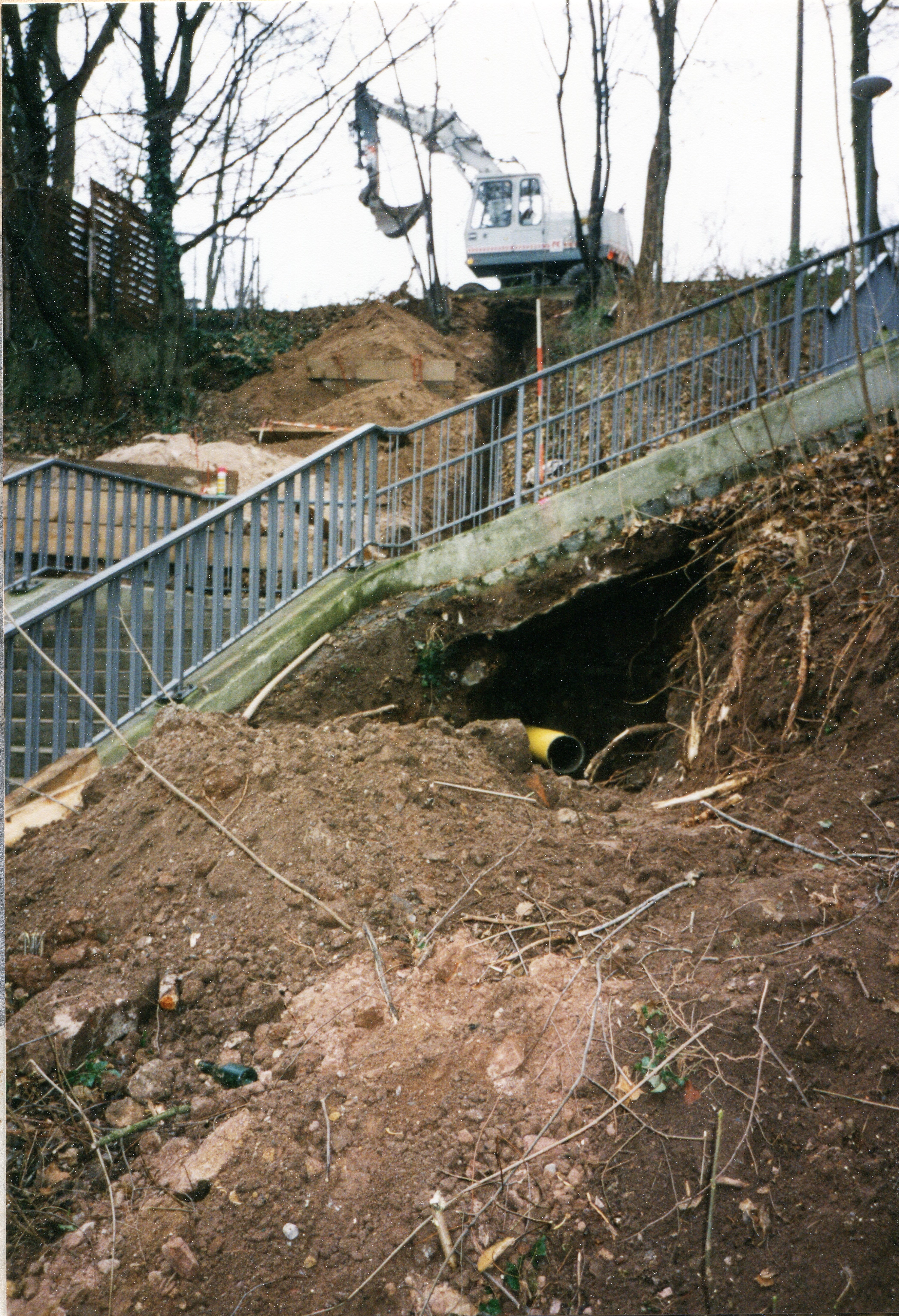 | Beschreibung | neue Gasleitung Verlegung am Treppenaufgang zum Klinikum Fürth an der Jakob-Henle-Straße im Februar 1998 | ||