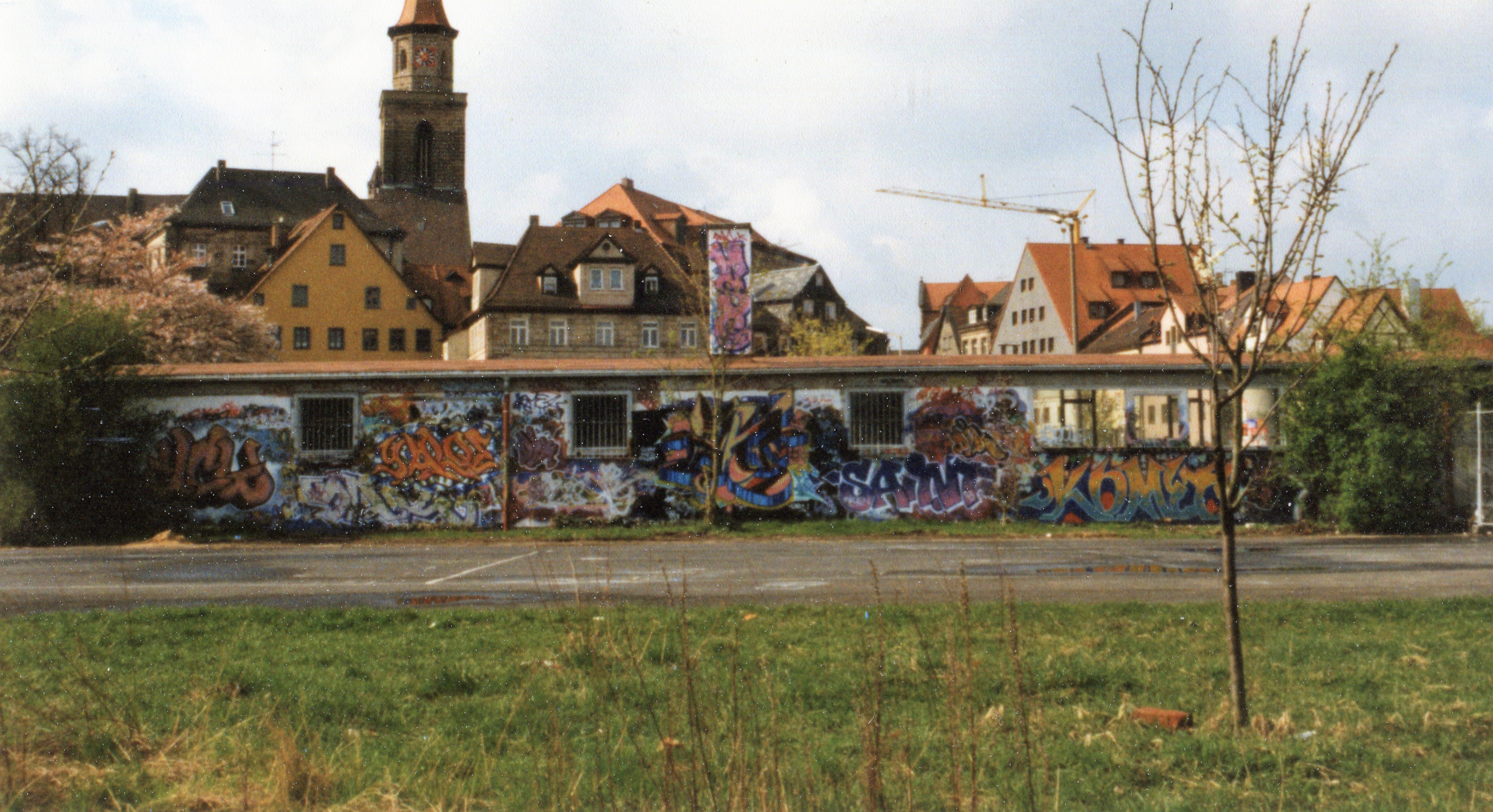 Beschreibungbunte Rückseite des ursprünglichen Jugendhaus Lindenhain, Blick zur Heiligenstraße im April 1998