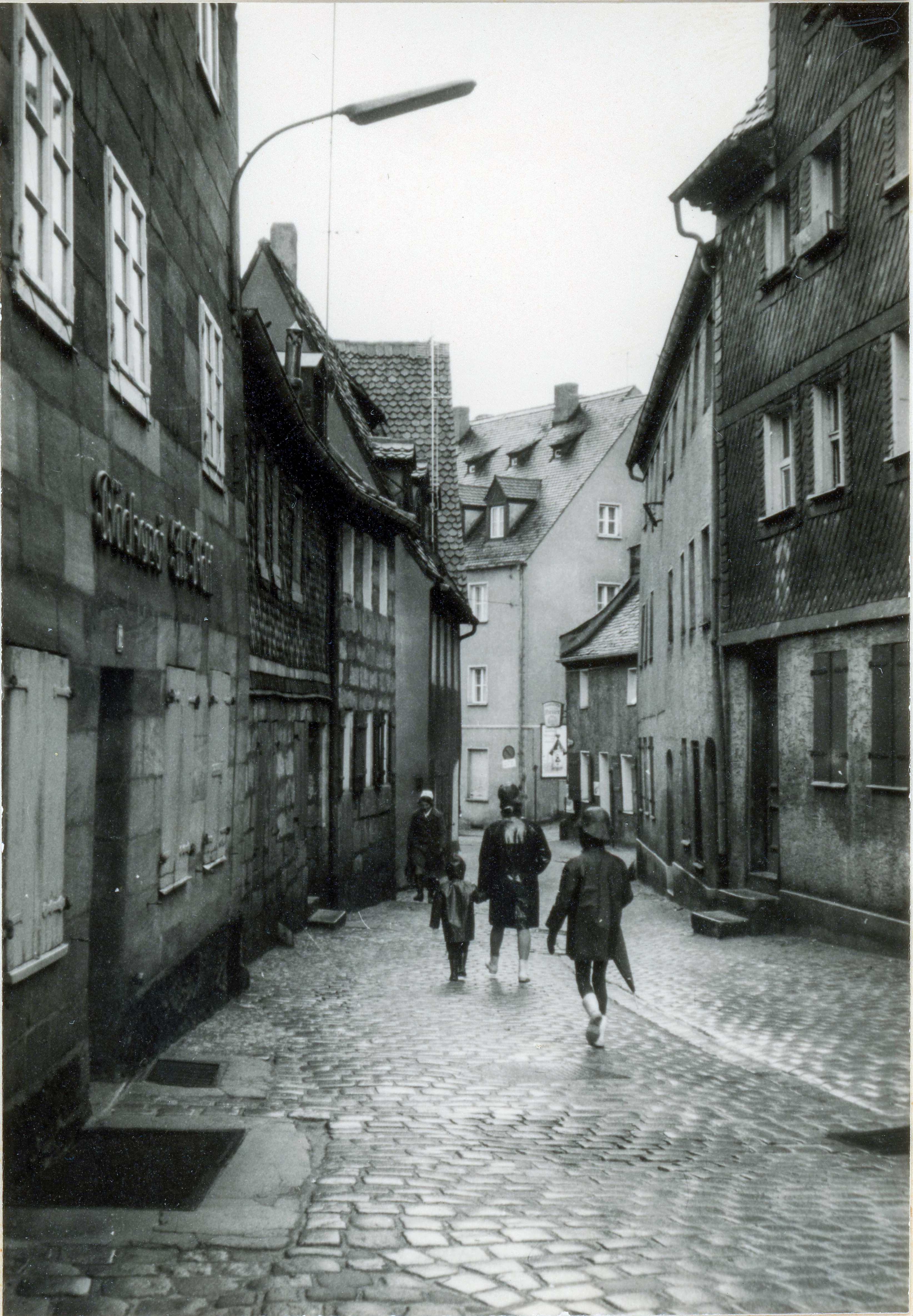 | Beschreibung | Blick in die Rednitzstraße (v. l. n. r.): Nr. 12, 10, 8, 6 und Giebel von 4 – Bildmitte hinten: Neubau Königstraße 6 (nach 2. Weltkrieg), Rednitzstraße 3, 5, 7 | ||