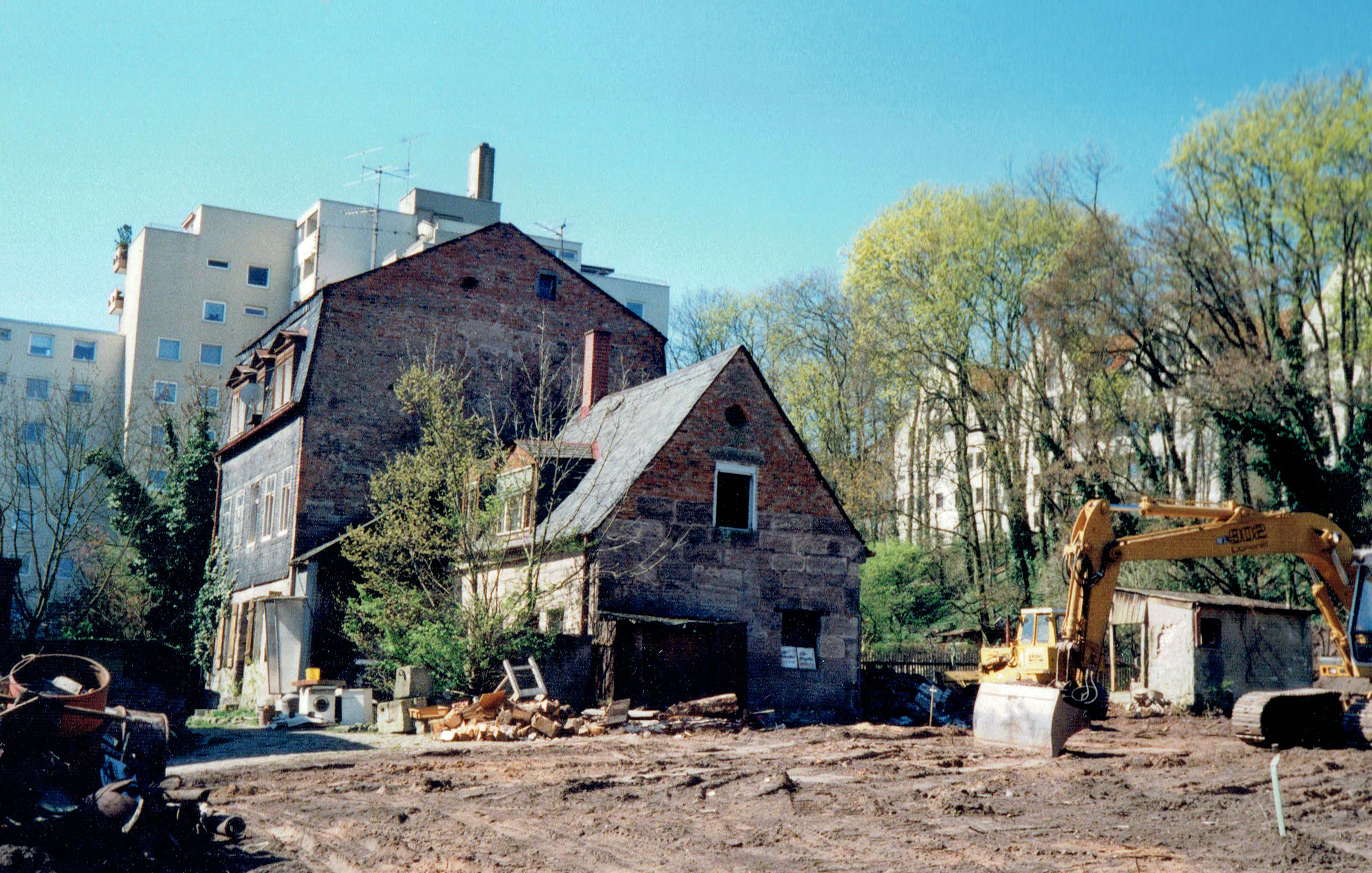 | Beschreibung | Baustelle hinter dem Schlössla, ehemalige Häuser, heute Vacher Straße 11, April 2000 | ||