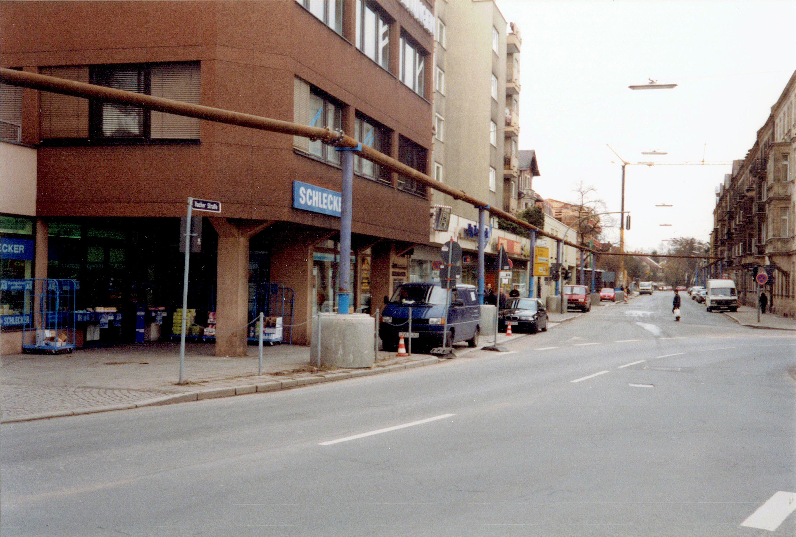 | Beschreibung | Wasserableitungsrohre durch die Vacher Straße, im Rahmen des Weiterbaus der U-Bahn, Februar 2001 | ||