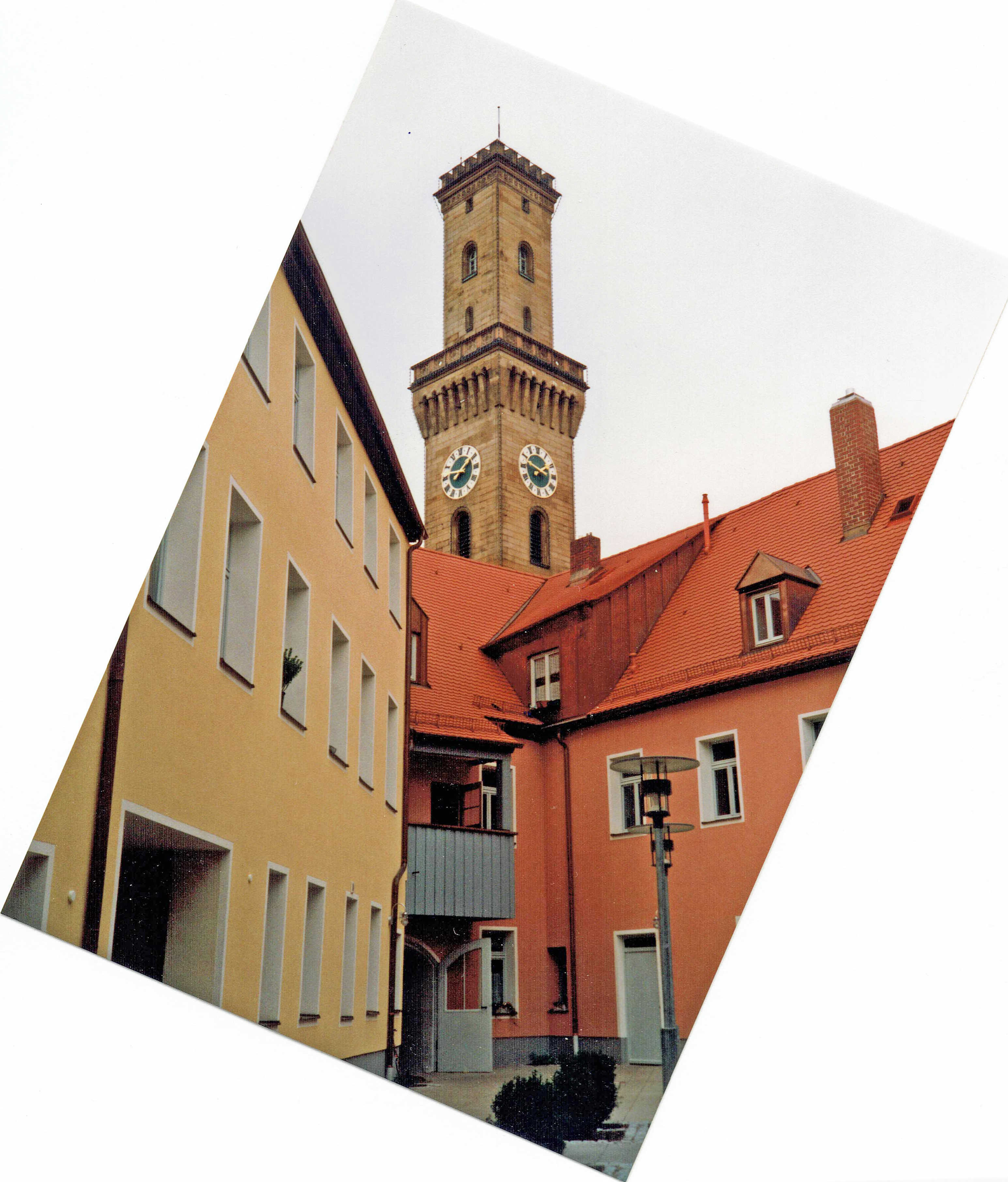 | Beschreibung | Der frisch renovierte Innenhof des Kronprinzenhofs mit dem Rathausturm, April 2001 | ||