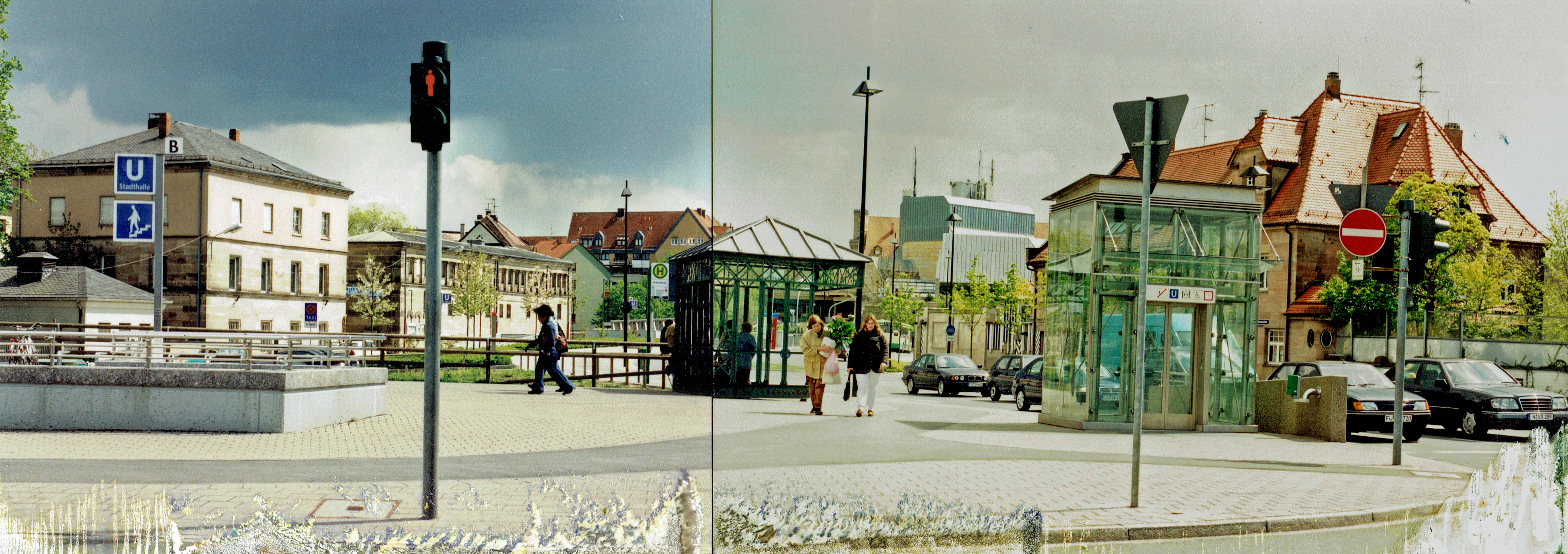 Das Bild ist aus zwei Einzelaufnahmen, mit Wasserschaden, zusammengesetzt. Im Hintergrund die für die Haltestelle namensgebende Stadthalle.
