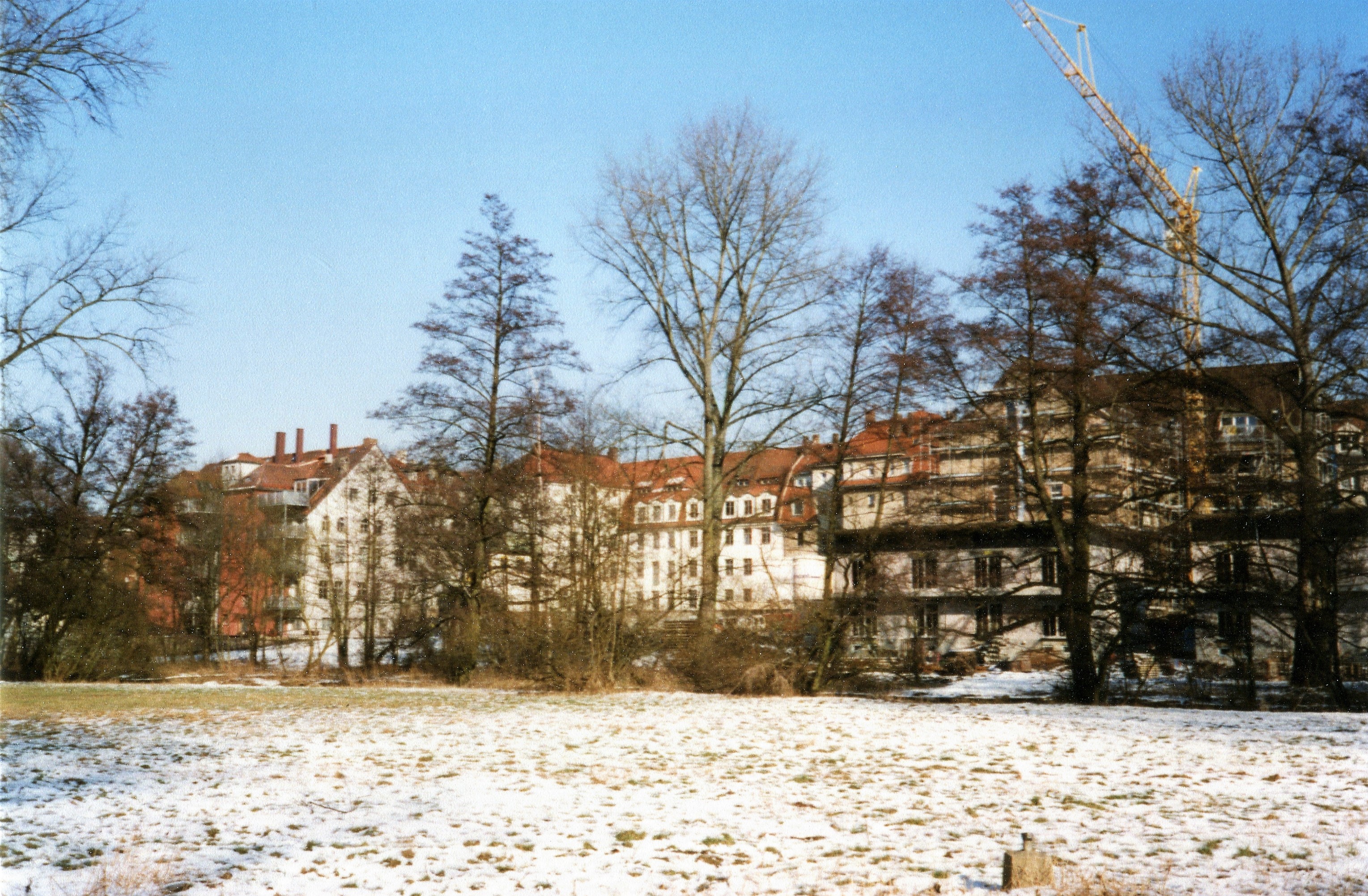 | Beschreibung | Blick vom Waldmannsweiher über die Rednitz zu der Häuserzeile in der Badstraße im Februar 2003 | ||