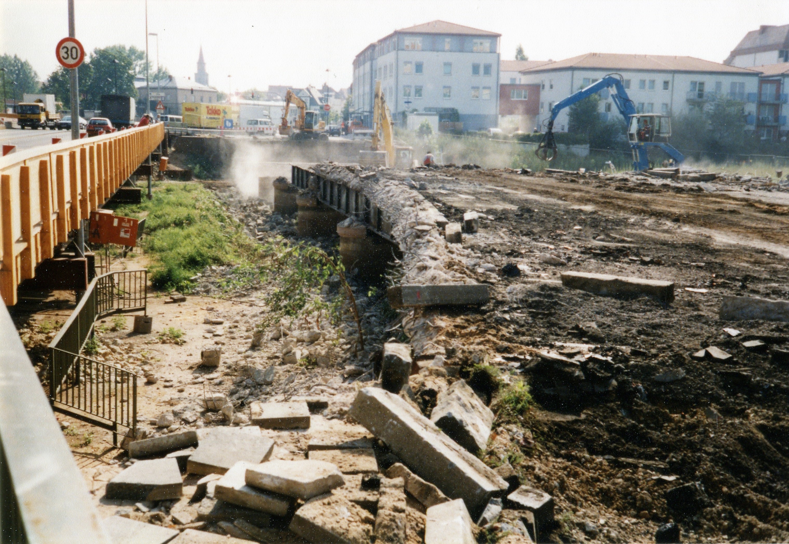 | Beschreibung | Abriss der alten Flutbrücke, daneben die Behelfsbrücke (Holzkonstruktion) im Wiesengrund, im Hintergrund Hotel am Forum und Kulturforum am 21. August 2003 | ||