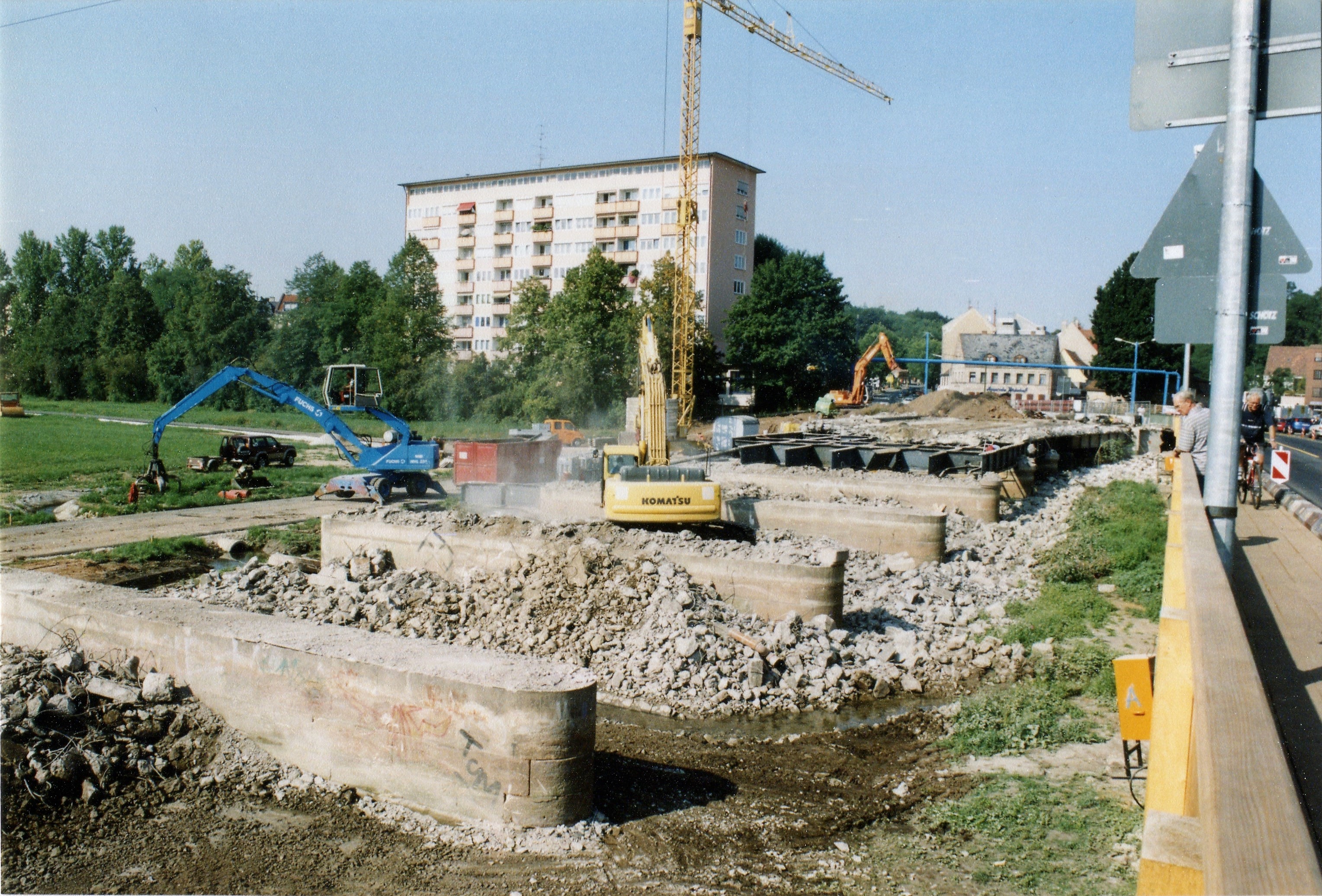 | Beschreibung | Abriss der alten Flutbrücke, daneben die hölzerne Behelfsbrücke, im Hintergrund Hochhaus Cadolzburger Straße 1 am 21. August 2003 | ||