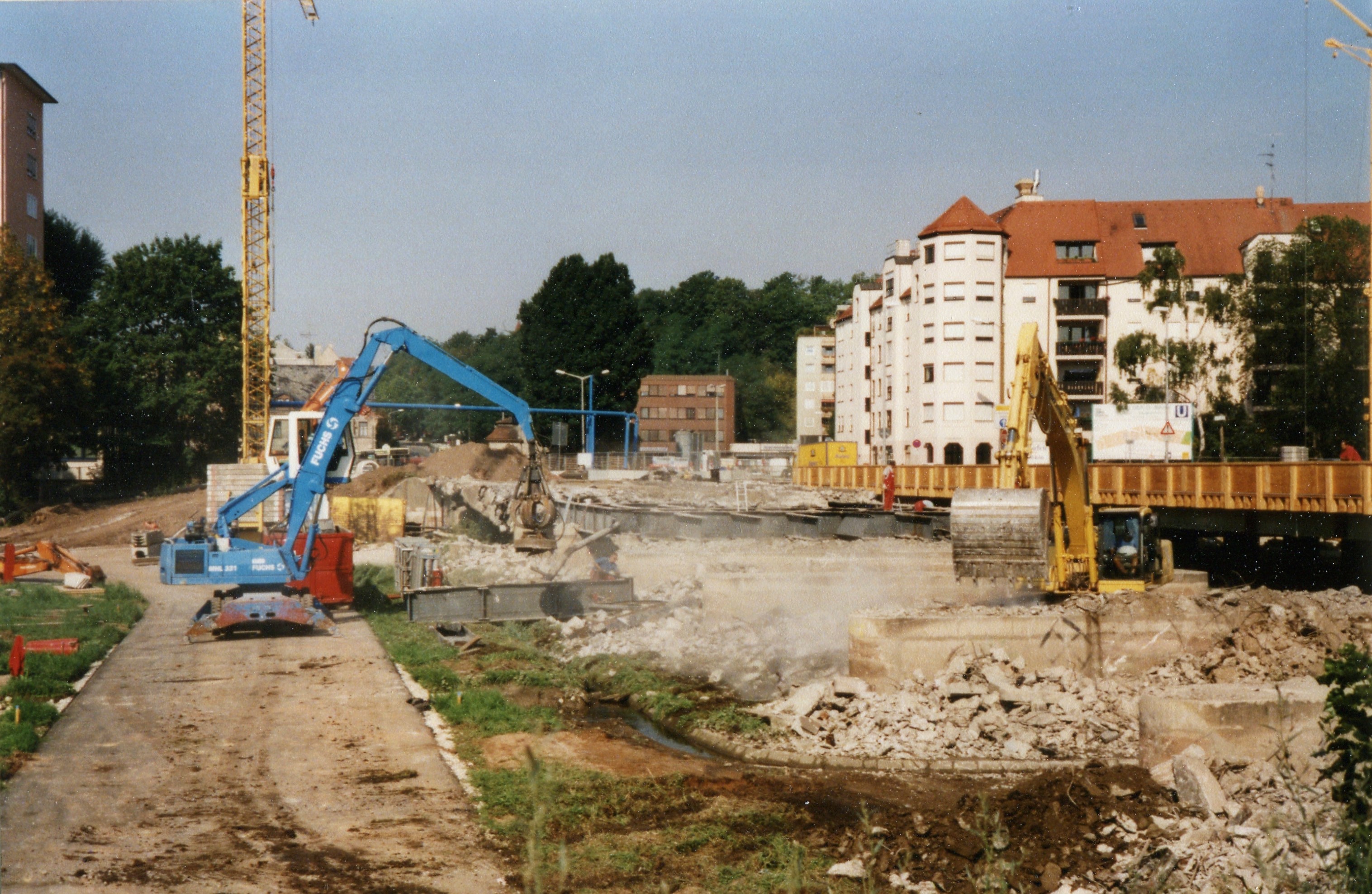 | Beschreibung | Abriss der alten Flutbrücke, daneben die hölzerne Behelfsbrücke, im Hintergrund Wohnanlage Billinganlage 2, 4, 6, 8 am 21. August 2003 | ||