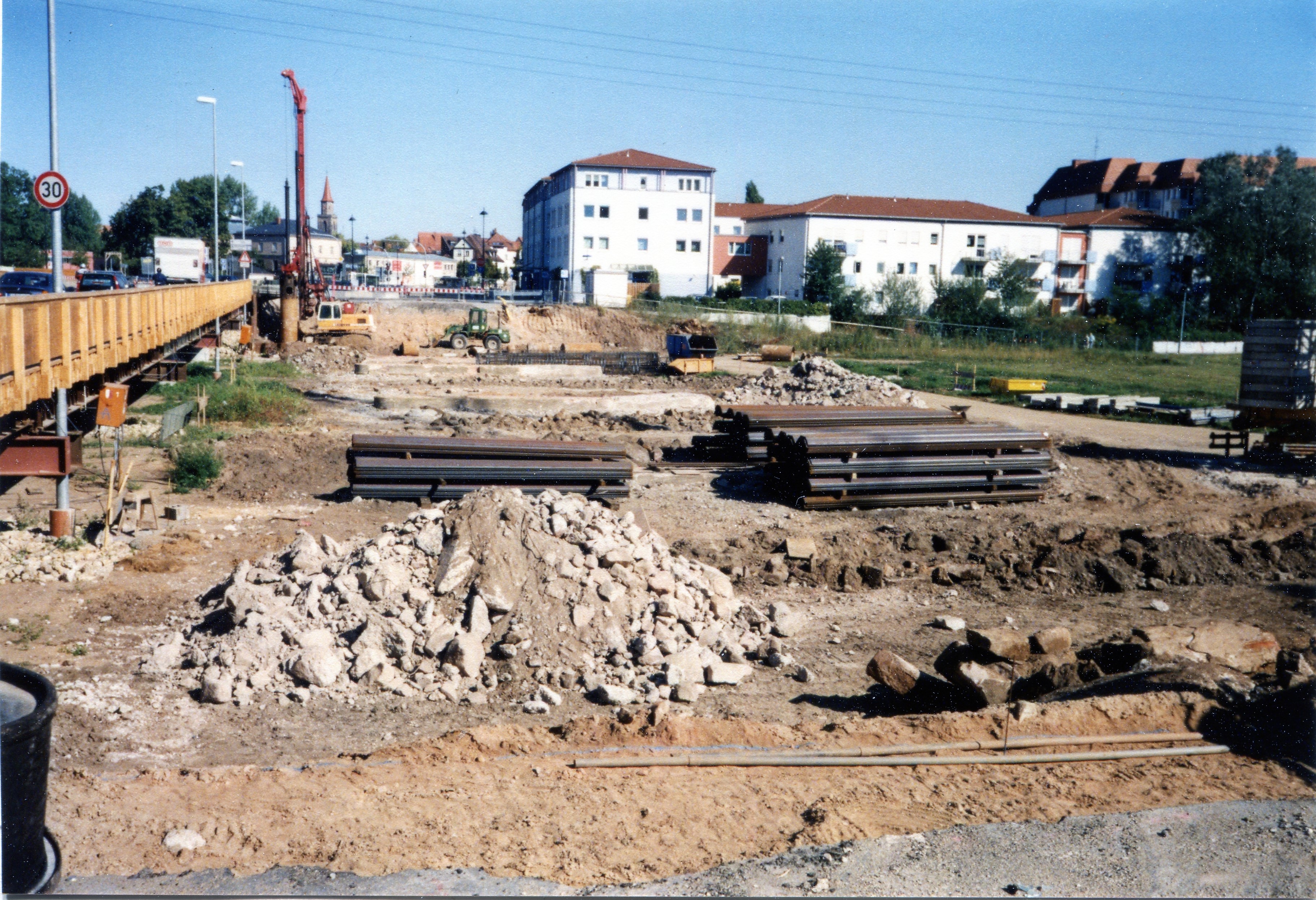 | Beschreibung | Abriss der alten Flutbrücke, daneben die Behelfsbrücke (Holzkonstruktion) im Wiesengrund, im Hintergrund Hotel am Forum und Kulturforum am 5. September 2003 | ||