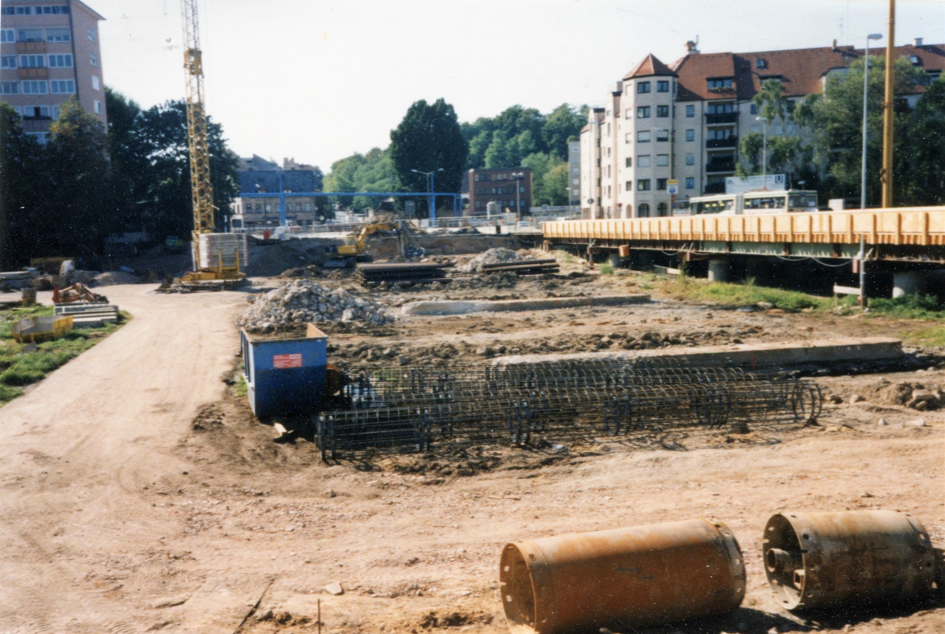 | Beschreibung | Neubau der Flutbrücke, daneben die hölzerne Behelfsbrücke, im Hintergrund Wohnanlage Billinganlage 2, 4, 6, 8 im September 2003 | ||