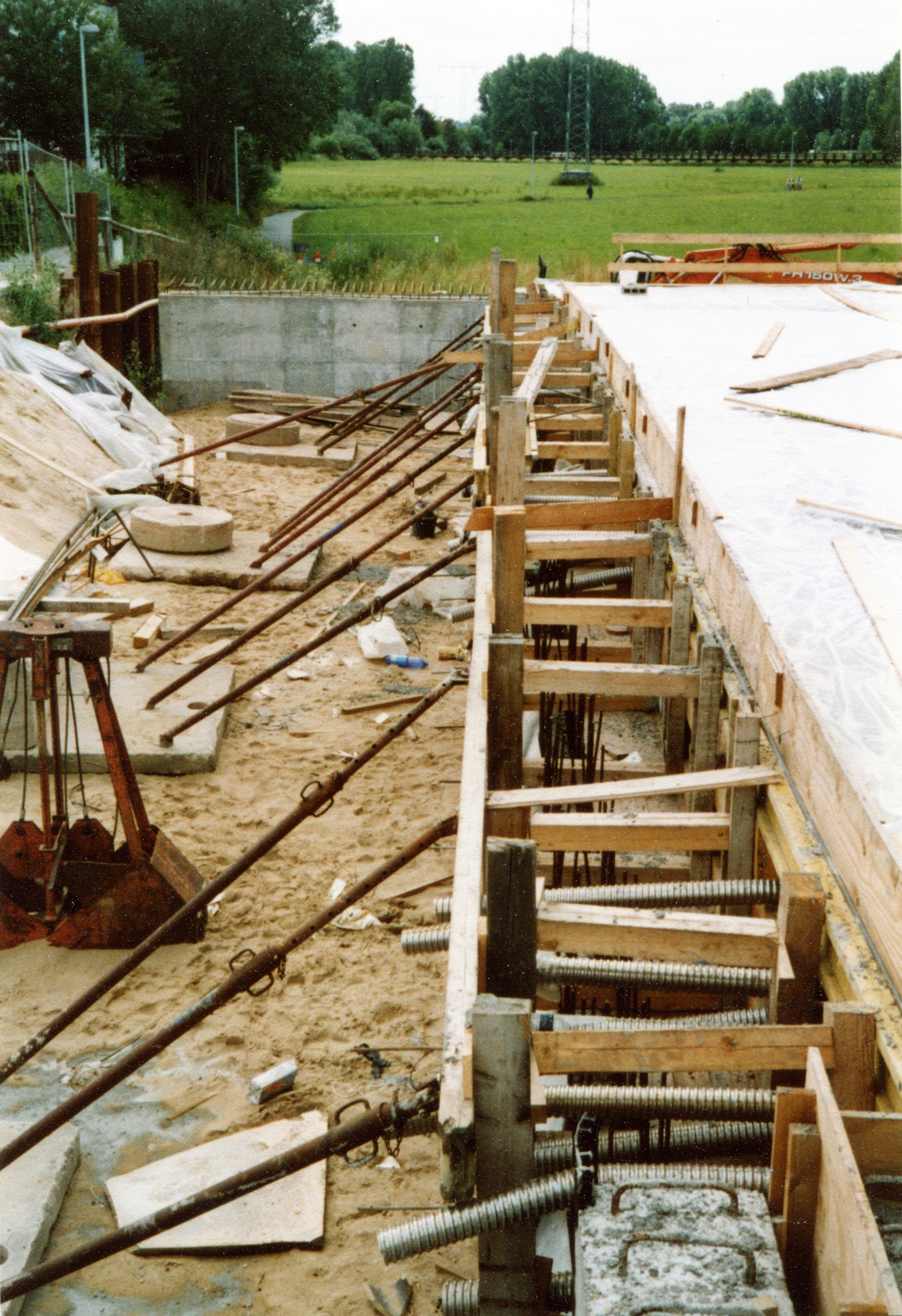 | Beschreibung | Neubau und neue Fahrbahn der Flutbrücke, mit noch leeren Hüllrohren, die später die Spannstahl Bündel aufnehmen werden. Im Hintergrund der Hardsteg am 02. Juli 2004 | ||