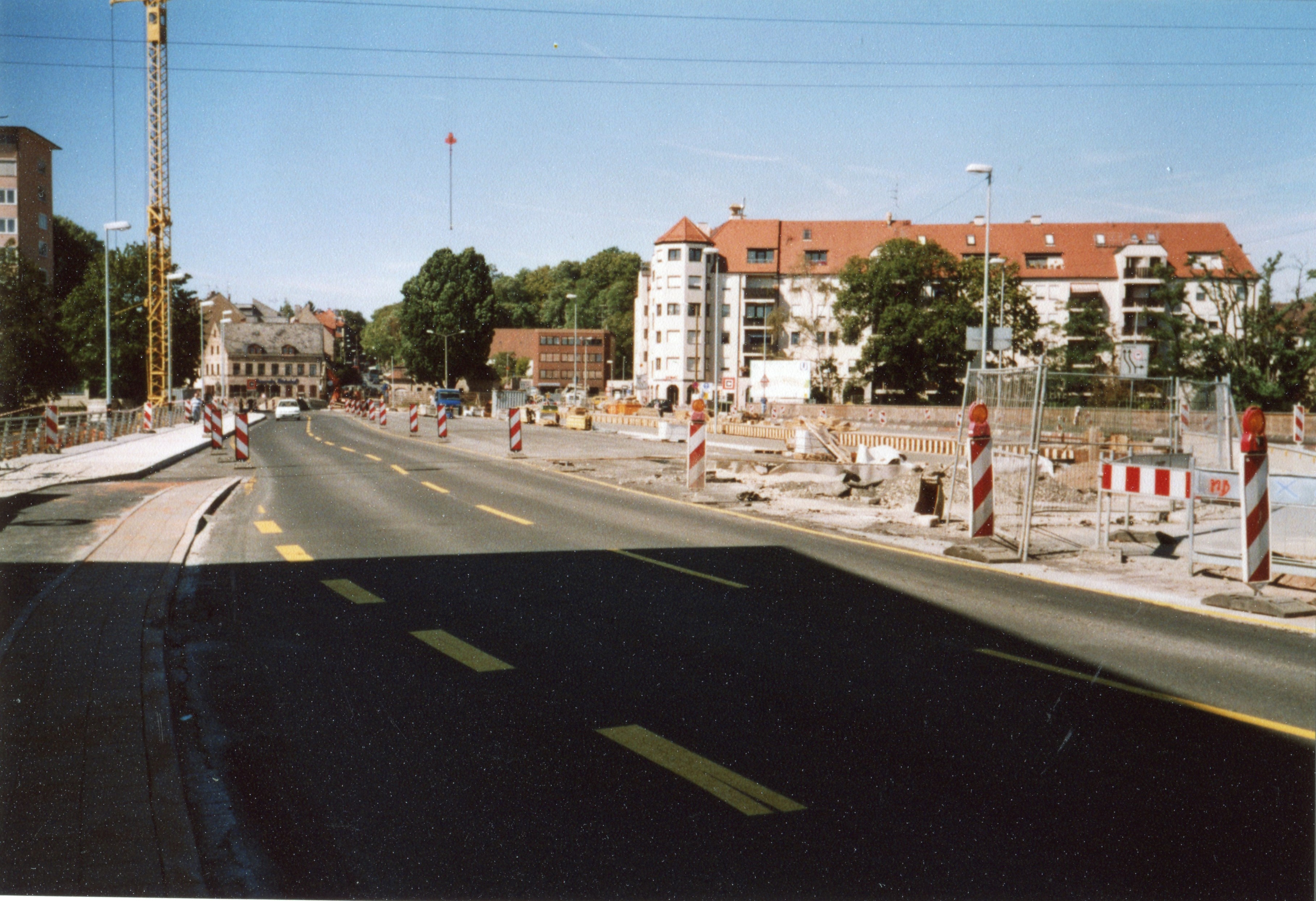 | Beschreibung | Neue Flutbrücke mit 2 freigegebenen Fahrspuren und rechts Behelfsbrücke, im Hintergrund Wohnanlage Billinganlage 2, 4, 6, 8 im September 2004 | ||