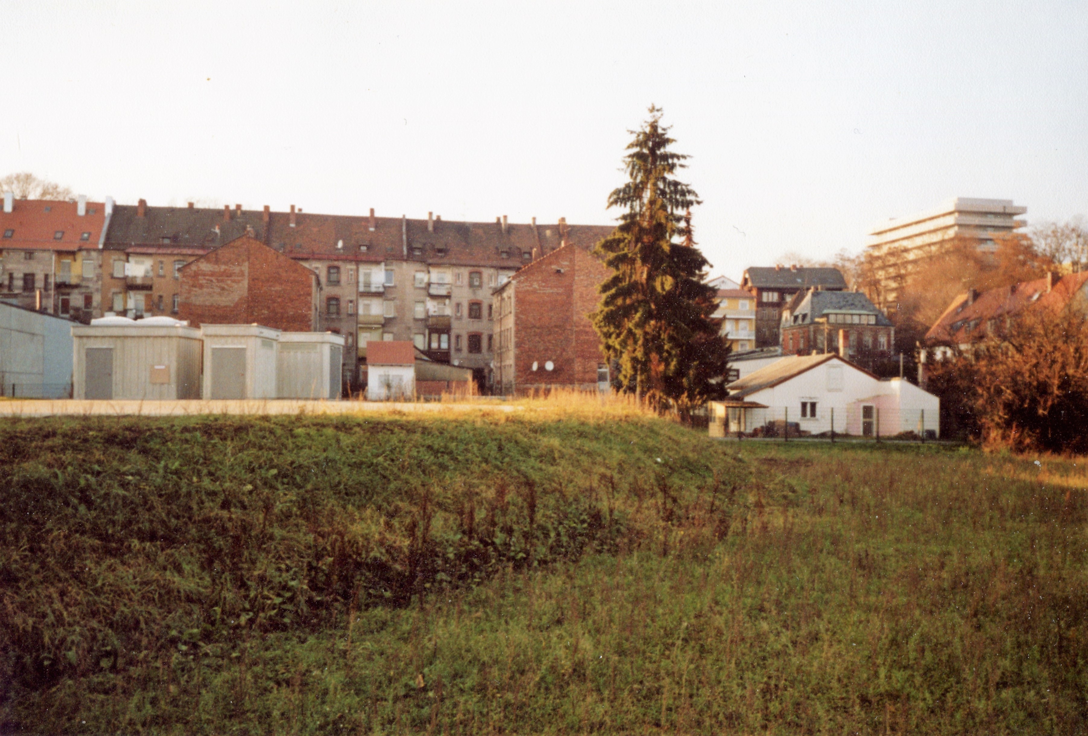| Beschreibung | Erhöht überdeckter U-Bahn-Tunnel im Wiesengrund vor der Unterquerung der Vacher Straße mit Häuserzeile 6–14, Dezember 2003 (links: Abluftschacht u. Notausstieg an der Abstell- und Kehranlage westl. des U-Bahnhofs Stadthalle) | ||