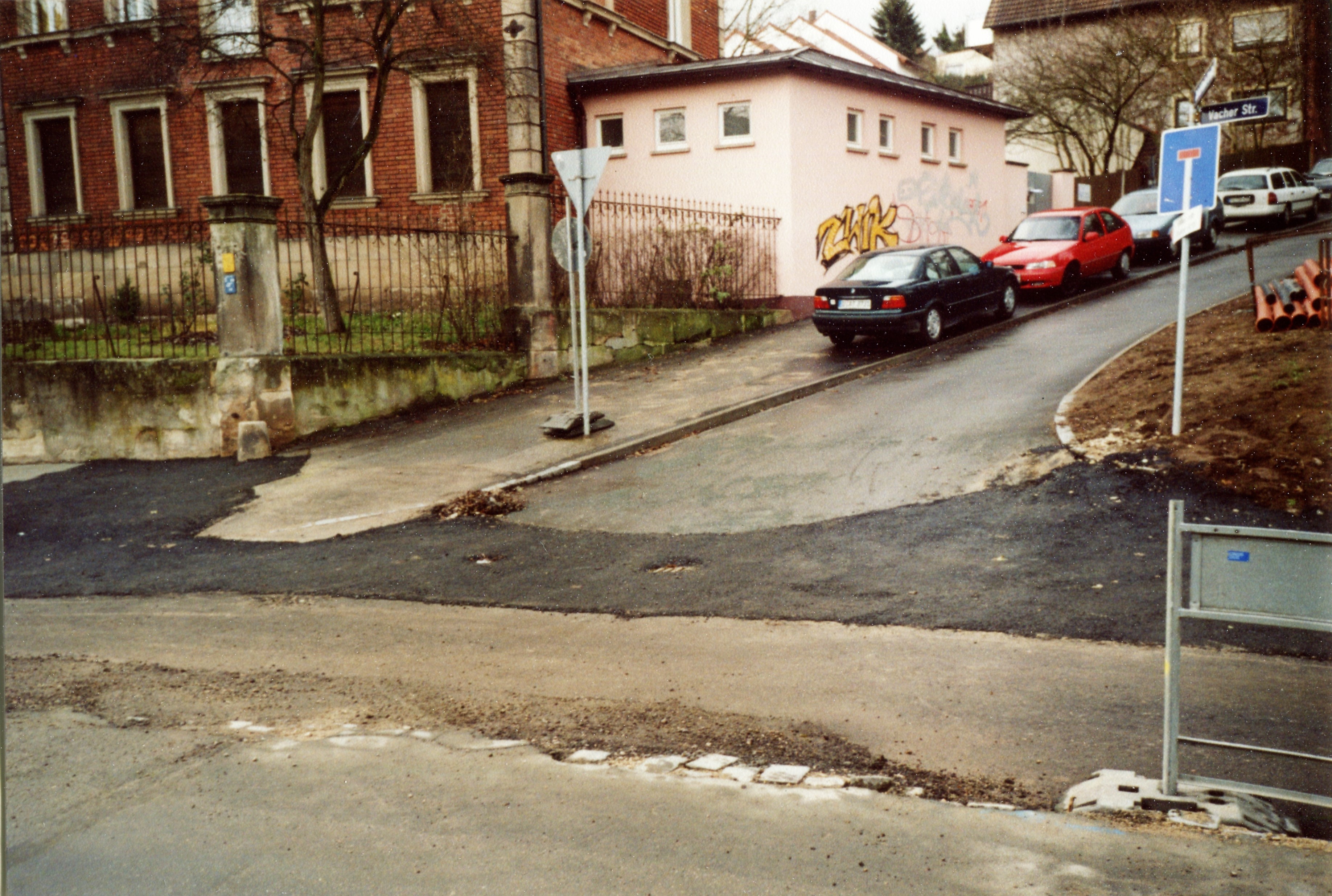 | Beschreibung | Blick von der Vacher Straße in die Jakob-Henle-Straße mit dem Kindergarten Kindervilla St. Martin und dahinter Jakob-Henle-Straße 40 im Dezember 2004 | ||