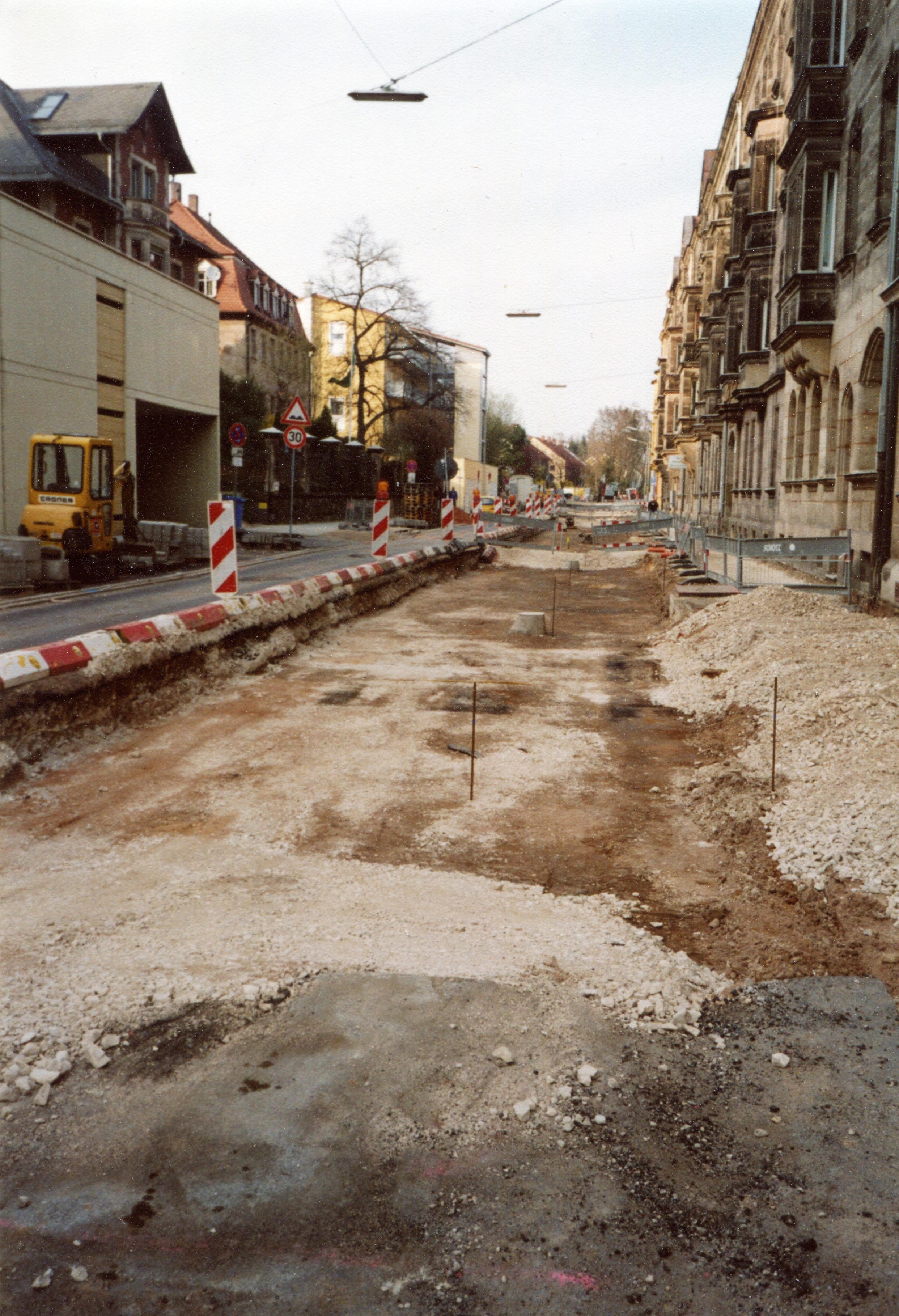 | Beschreibung | Straßenbau nach den Kanalarbeiten in der Vacher Straße, April 2005 – Blickrichtung Norden, links Gebäude mit Dacherker Vacher Straße 13, danach Vacher Straße 15 und Vacher Straße 23, rechts Häuserzeile Vacher Straße 4 – 14 | ||