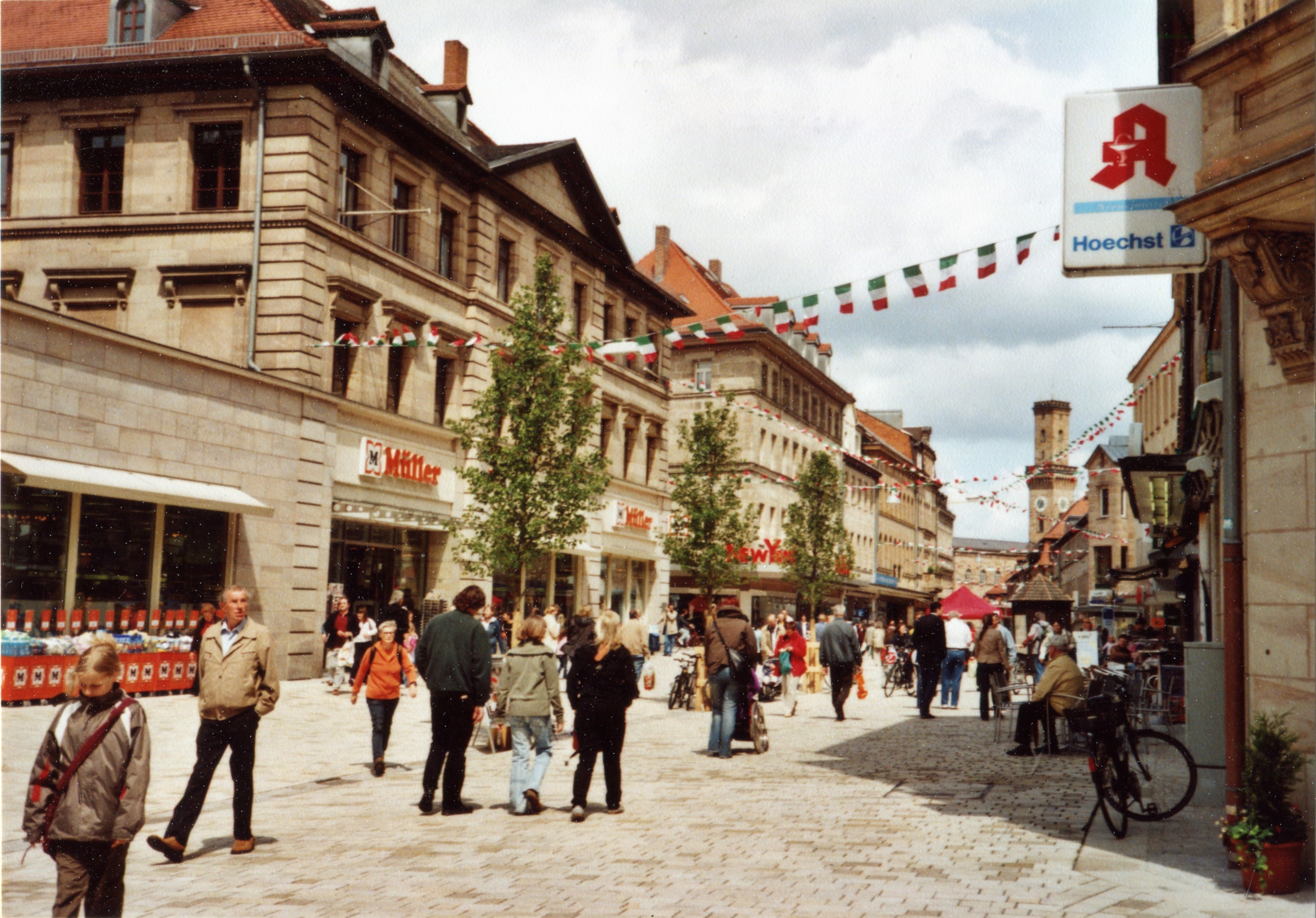 BeschreibungBlick in die untere Schwabacher Straße mit Gebäude links Schwabacher Straße 28, 30 und Schwabacher Straße 26 und fertig gepflasterte Fußgängerzone im Mai 2007