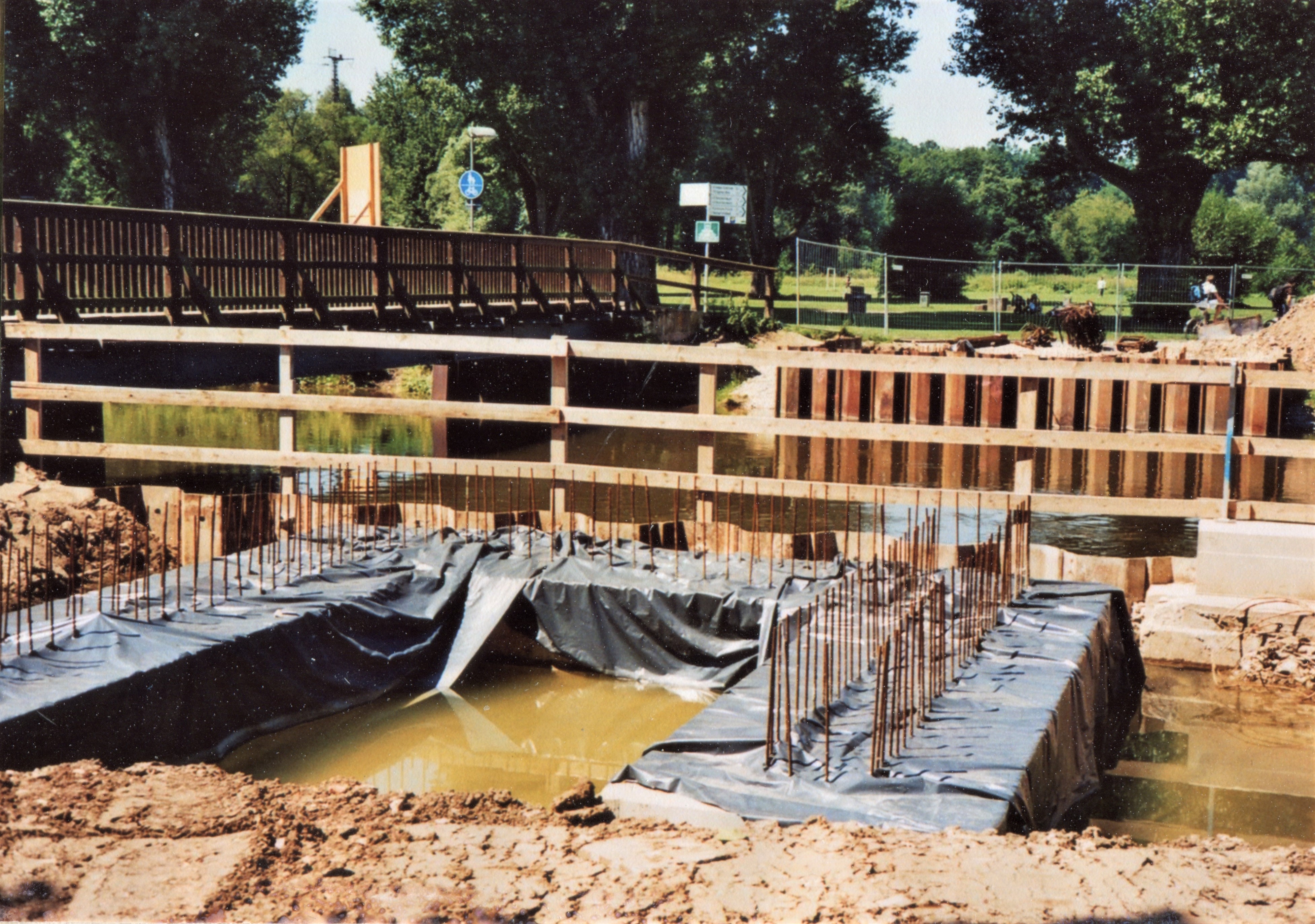 | Beschreibung | Neubau des Badstegs neben dem alten Steg mit neuen Betonfundament für das Widerlager, im Juli 2007 | ||