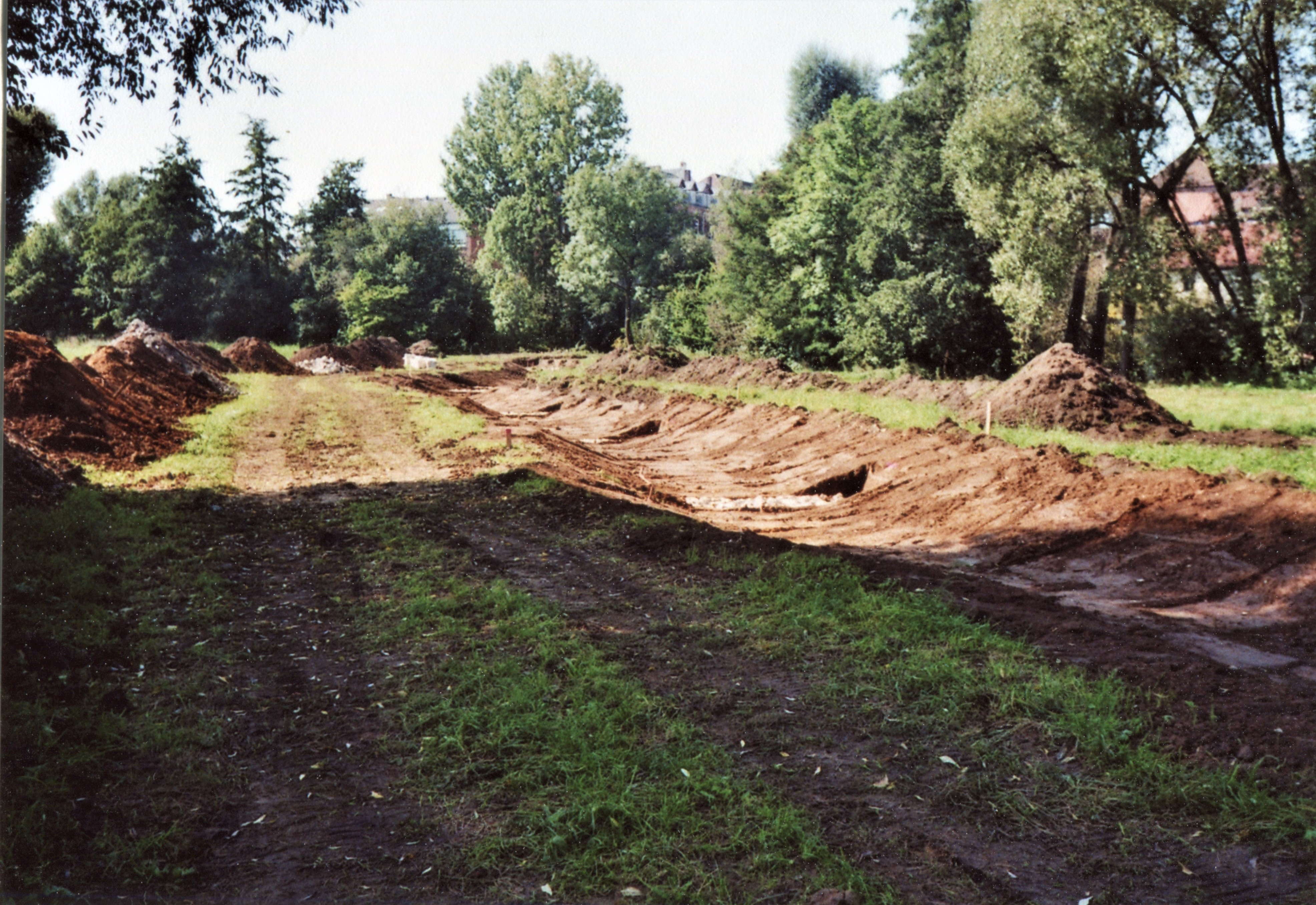 | Beschreibung | Bau des Umgehungsgerinnes mit Sohlschwellen für die Fischwanderung an der Pegnitz beim Ulmenweg, September 2007 | ||