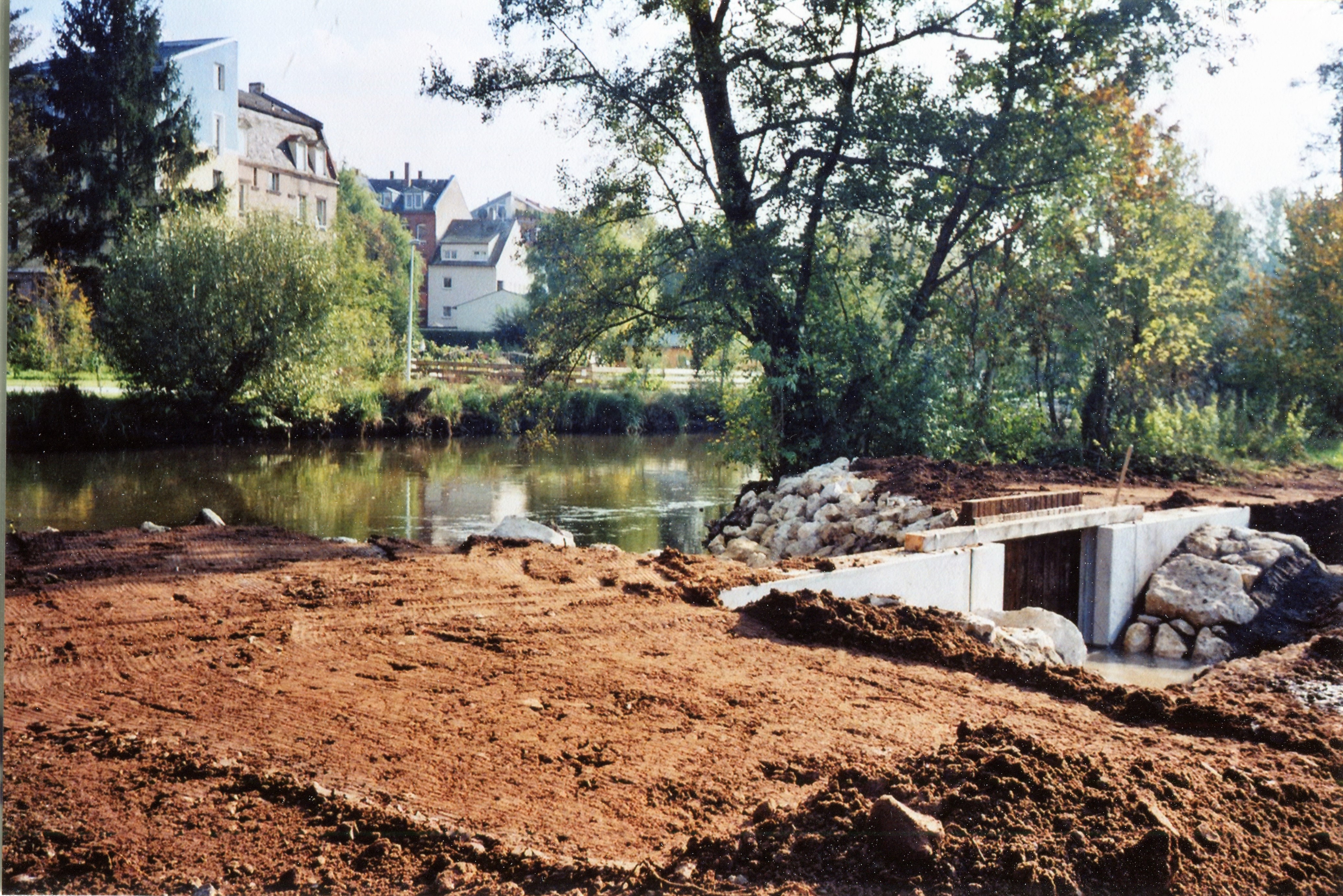 | Beschreibung | Auslassbauwerk mit prov. Stautafel an der Rednitz für den neuen Rednitzgraben, Juli 2007 | ||