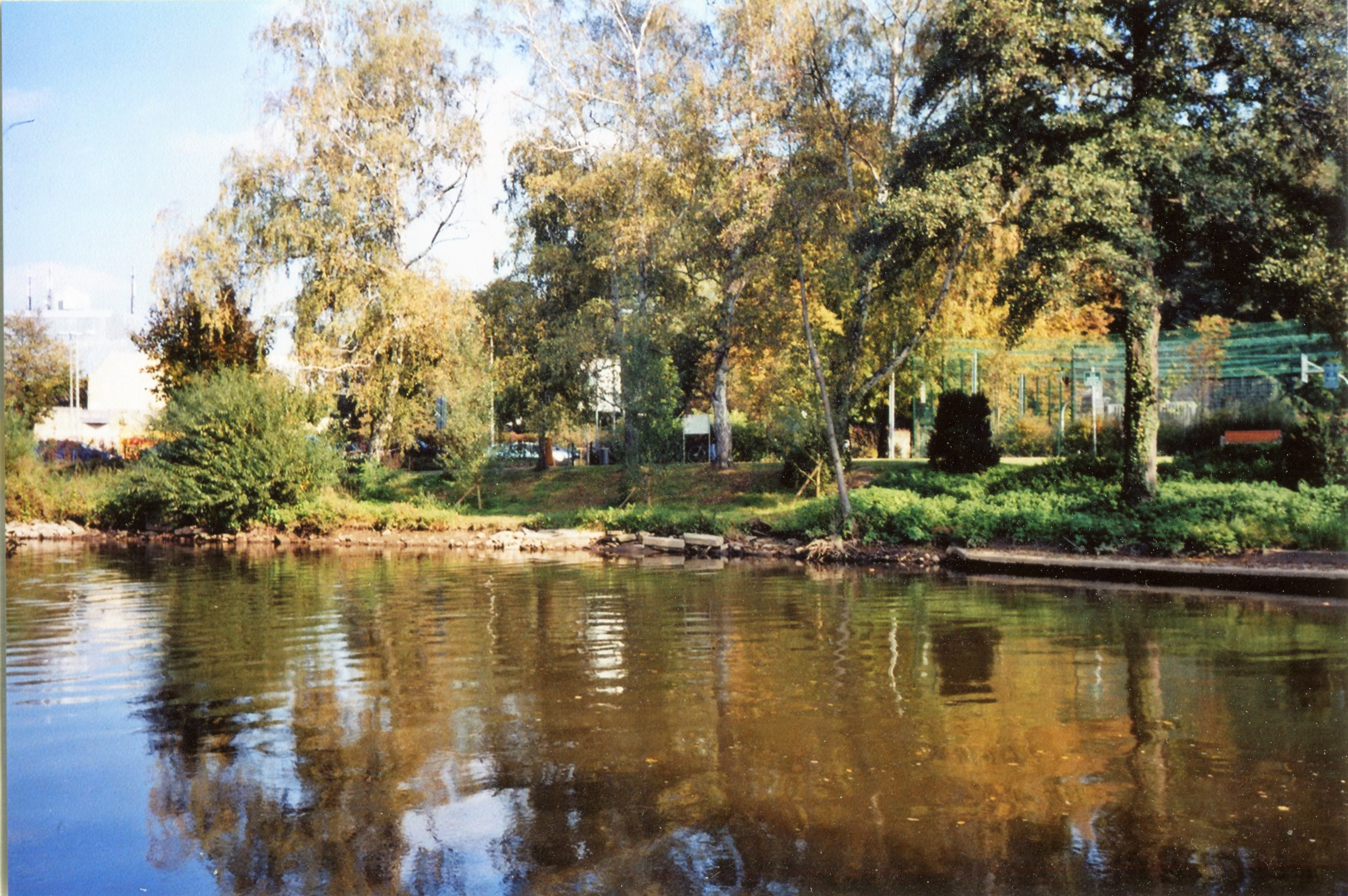 | Beschreibung | Rednitz von der Kursana Residenz aus, über dem Fluß die Uferpromenade und die Benario-Goldmann-Gedenkstätte im Juli 2007 | ||