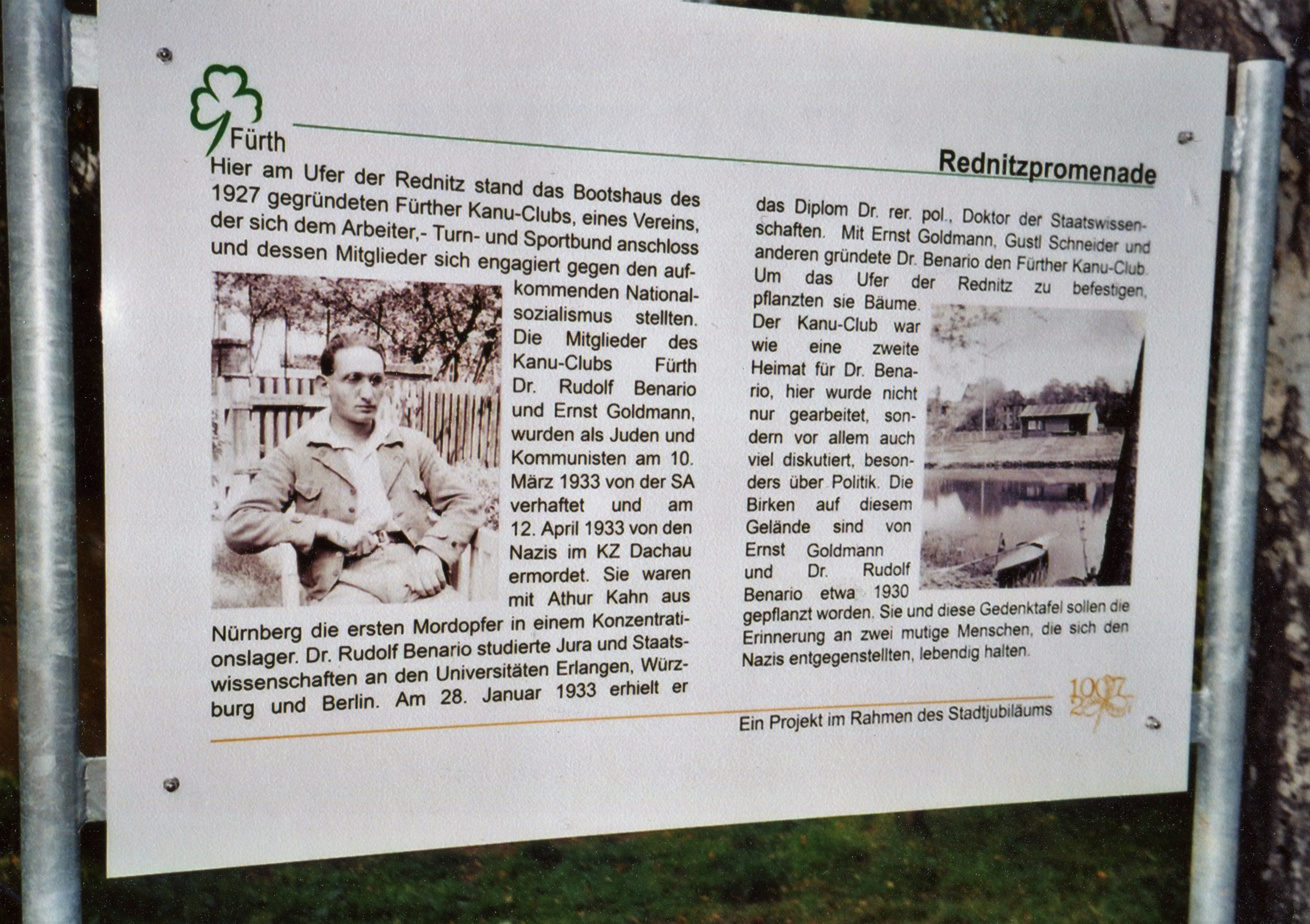 | Dateiinfo (Bild-Unterschrift und Info-Box, automatisch erstellt) | Hinweis Tafel an der Uferpromenade der Benario-Goldmann-Gedenkstätte im Oktober 2007 Urheber: Stadt Fürth<br>Erstellungsdatum: 11. Oktober 2007<br>Lizenz: copyright | ||