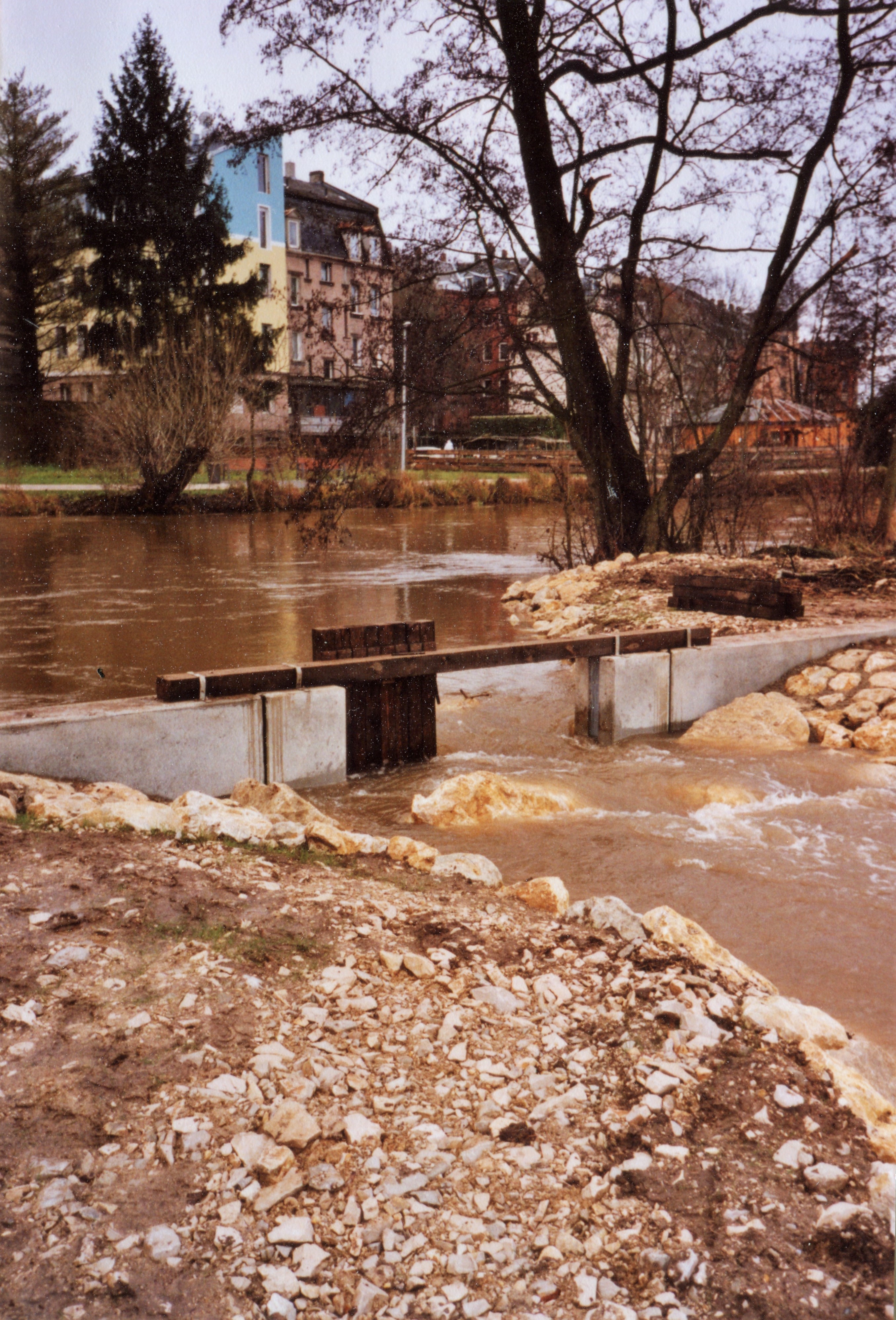 | Beschreibung | Auslass mit prov. Stautafel an der Rednitz oberhalb der Foerstermühle zum neuen Rednitzgraben, Dezember 2007 – im Hintergrund die Interkulturellen Gärten | ||