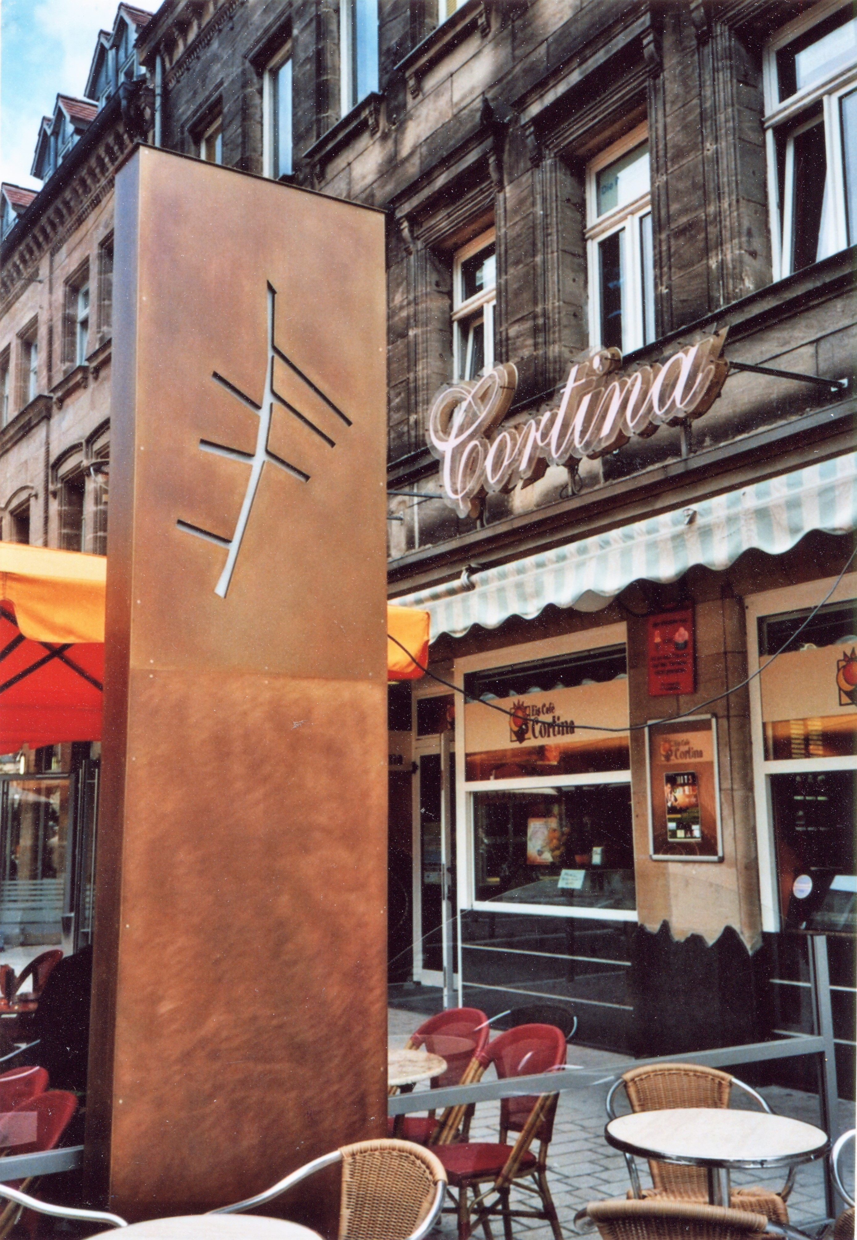 | Beschreibung | Neue Metallstele (Bronzelegierung) in der Fußgängerzone vor Gebäude Schwabacher Straße 45, Mai 2009 | ||