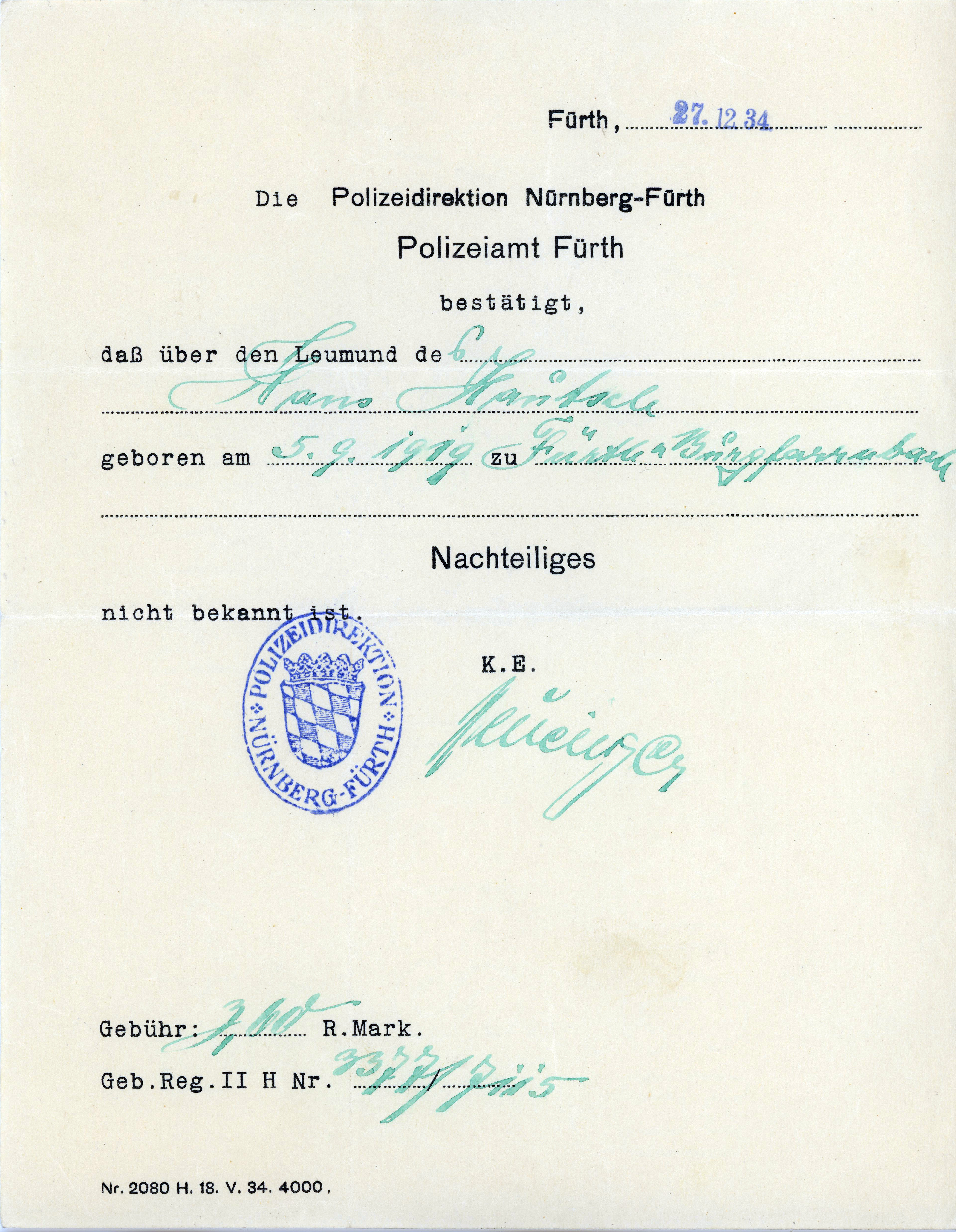 | Beschreibung | Polizeiliches Führungszeugnis, Dez. 1934 | ||